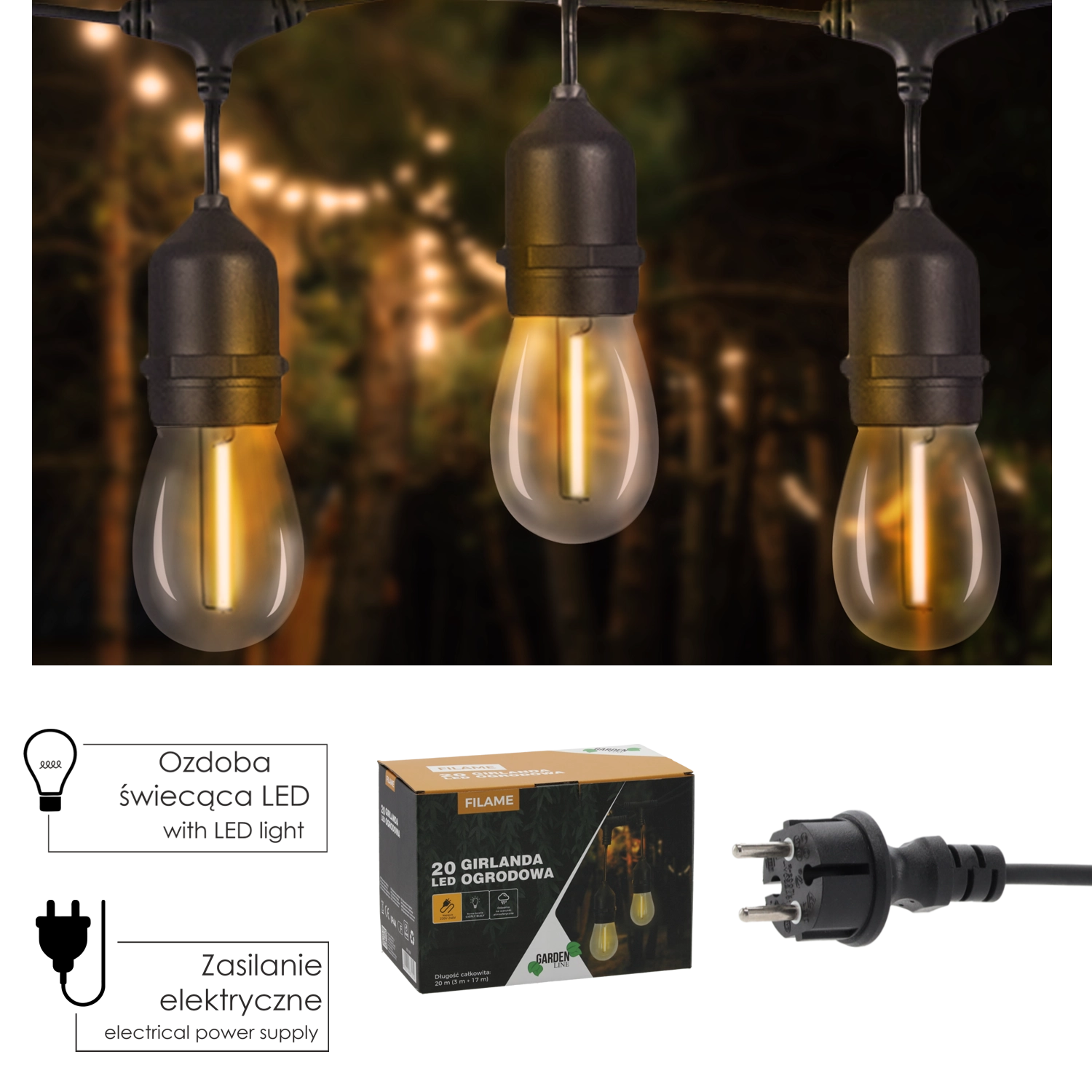 Tato vysokonapěťová zahradní girlanda kombinuje moderní i nadčasový vzhled s praktickými funkcemi pro každodenní použití. Díky rovnoměrnému rozestupu žárovek poskytuje příjemné, rovnoměrné osvětlení a vytváří útulnou atmosféru pro posezení, slavnosti i dekorace po celý rok.