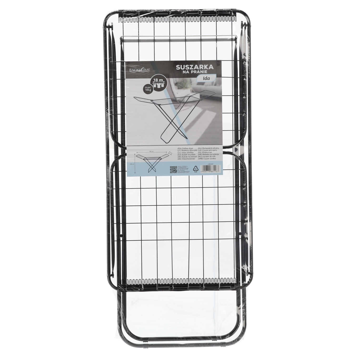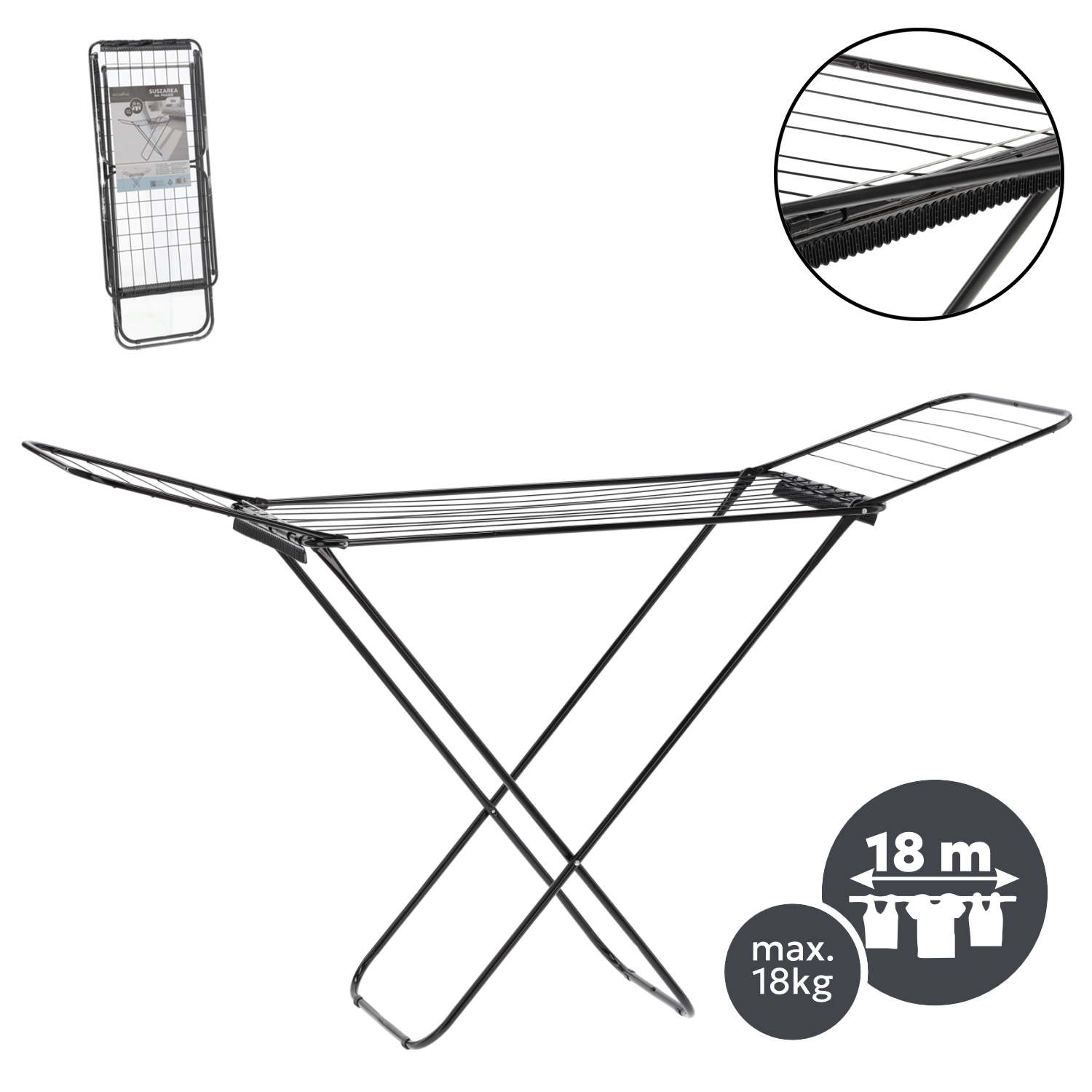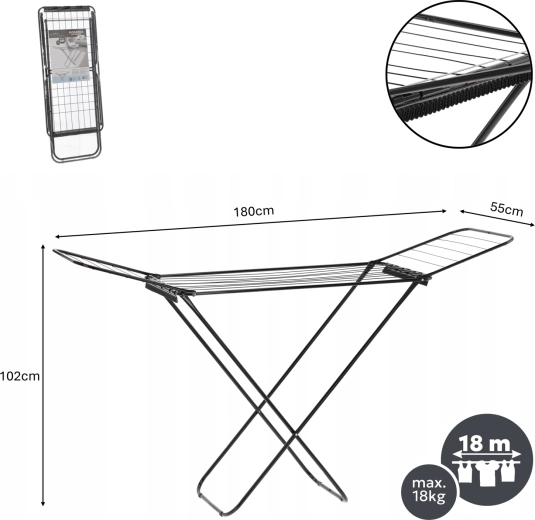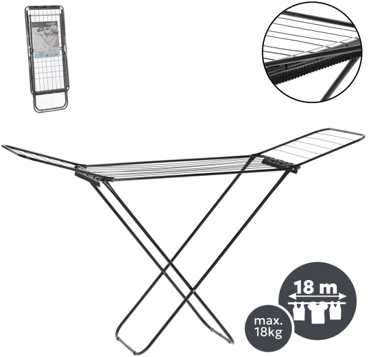 Praktický a stylový sušák na prádlo s rozkládacími křídly nabízí až 18 m sušicí plochy a dva držáky na ponožky pro drobné kusy prádla. Díky pevné ocelové konstrukci, matně černému provedení a skládacímu designu šetří místo a usnadňuje každodenní sušení bez elektřiny.