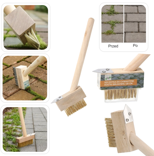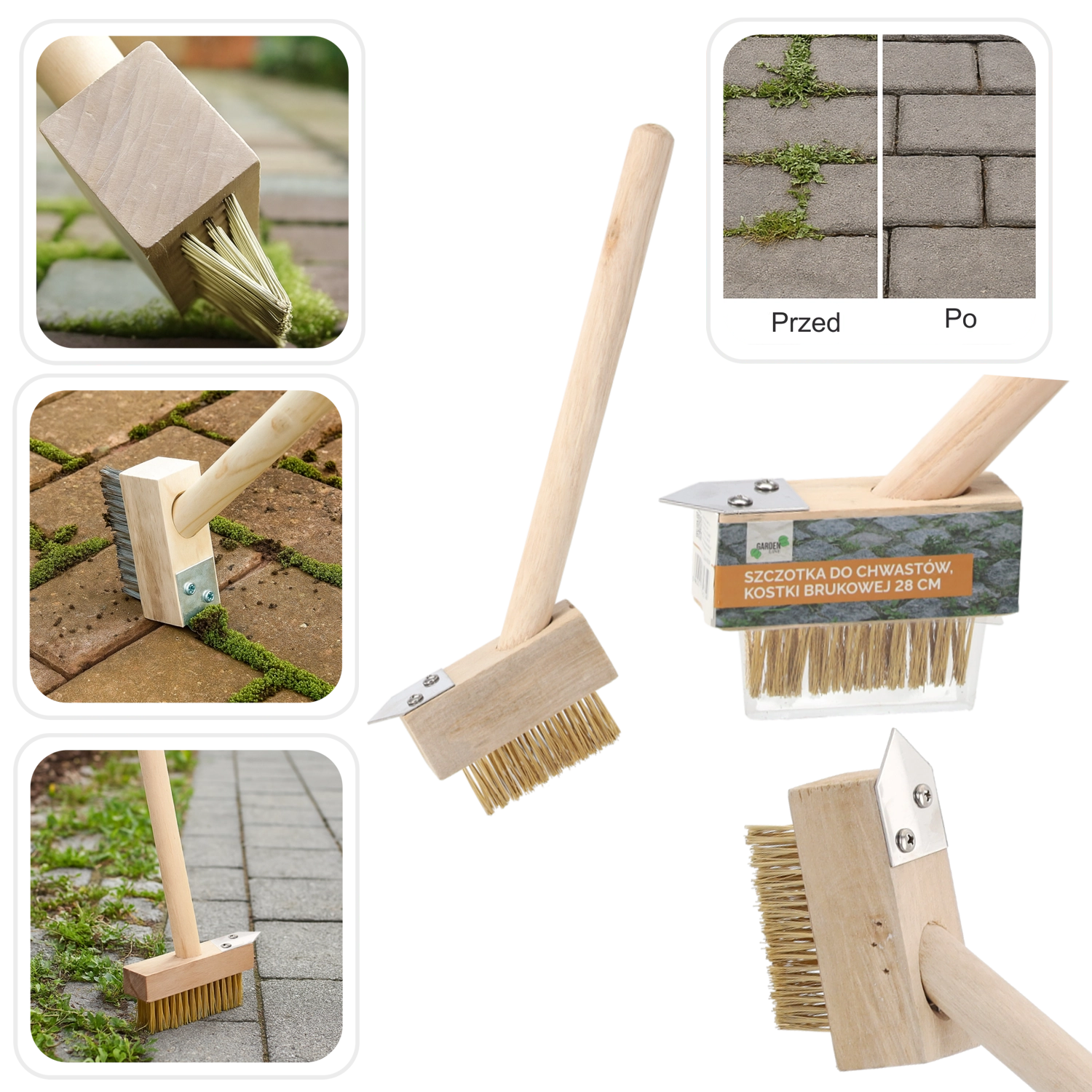 Kompaktní a odolný kartáč na plevel a spáry dlažby s délkou 28 cm účinně čistí mezery mezi dlažebními kostkami a chodníkovými deskami. Kombinuje pevné kovové štětiny se stírací ocelovou hranou pro odstranění mechu, trávy i zarostlých nečistot. Díky ergonomickému dřevěnému držadlu se pohodlně používá a usnadní pravidelnou údržbu terasy, chodníků i příjezdových cest.
