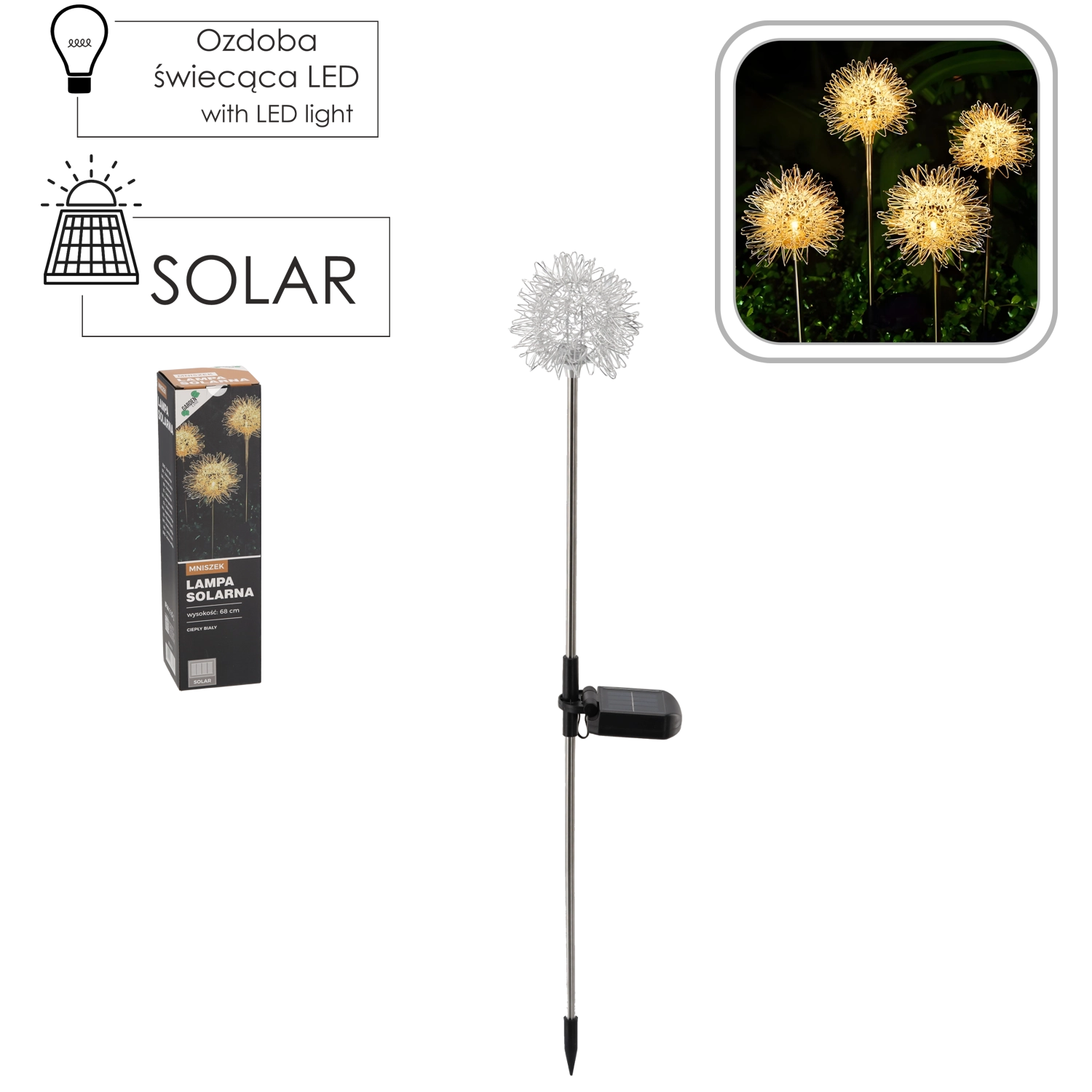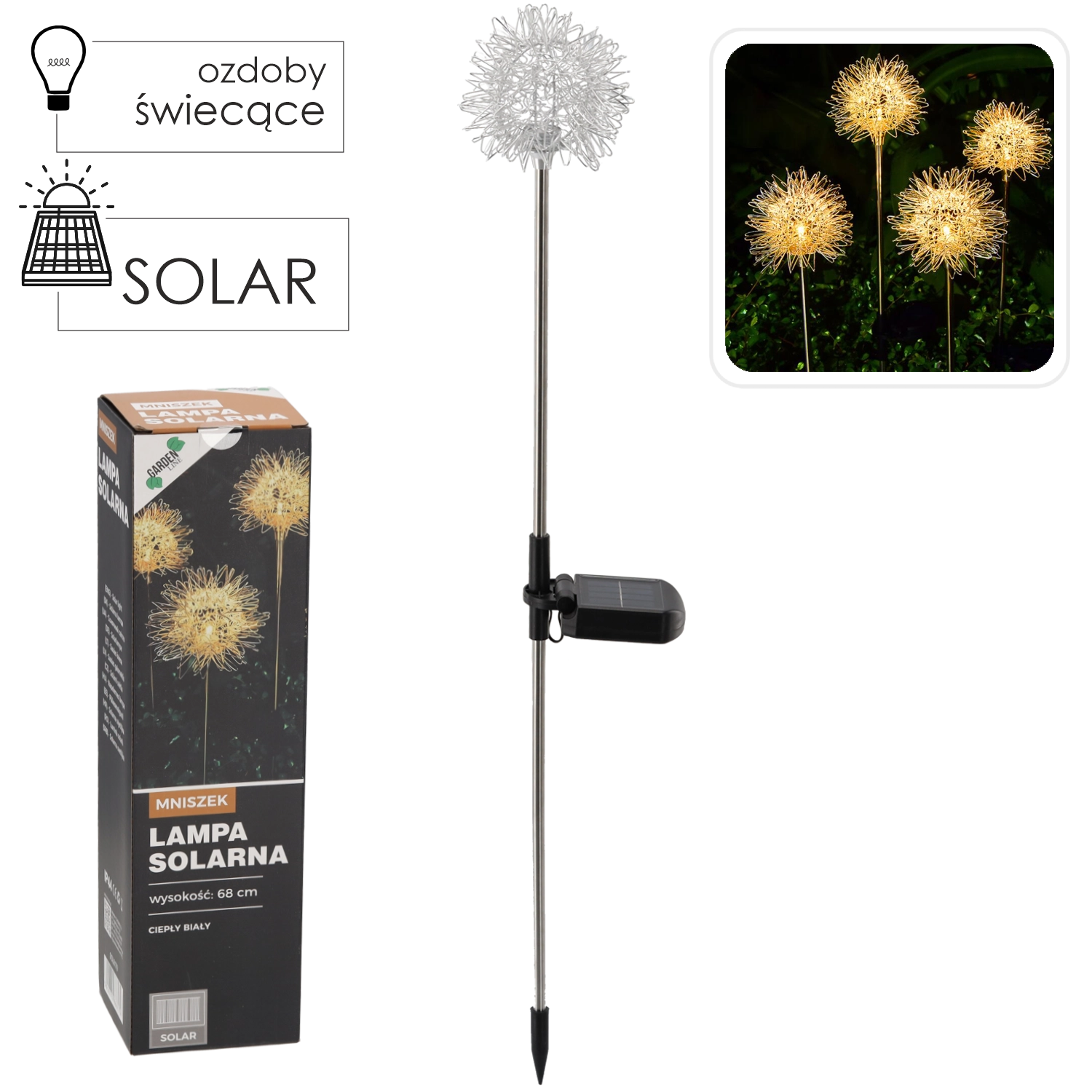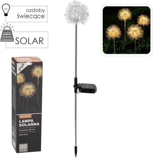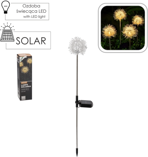 Dekorativní solární lampa ve tvaru pampelišky rozzáří vaši zahradu příjemným světlem. Díky integrovanému solárnímu panelu a akumulátoru svítí bez kabelů a údržby. Užijte si teplé bílé LED světlo, automatické nabíjení na slunci a odolnost IP44 pro venkovní použití.