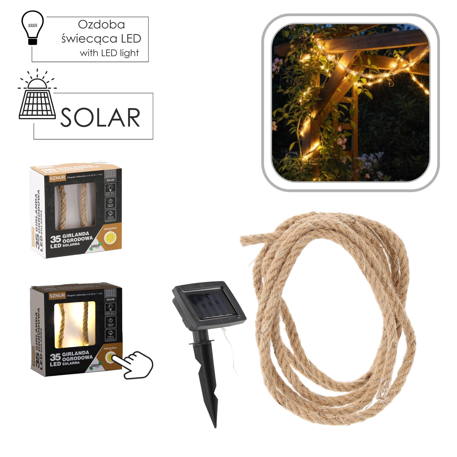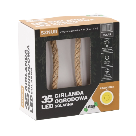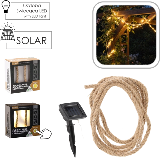 Stylová solární světelná girlanda s 35 teplými bílými LED krásně rozzáří váš balkon, terasu i zahradu. Díky solárnímu napájení nevyžaduje zásuvku ani další náklady na provoz. Nabízí 2 režimy svícení (stálé svícení nebo blikání), je odolná vůči povětrnosti IP44 a díky celkové délce 4 m snadno ozdobí pergolu, zábradlí či rostlinné kompozice.