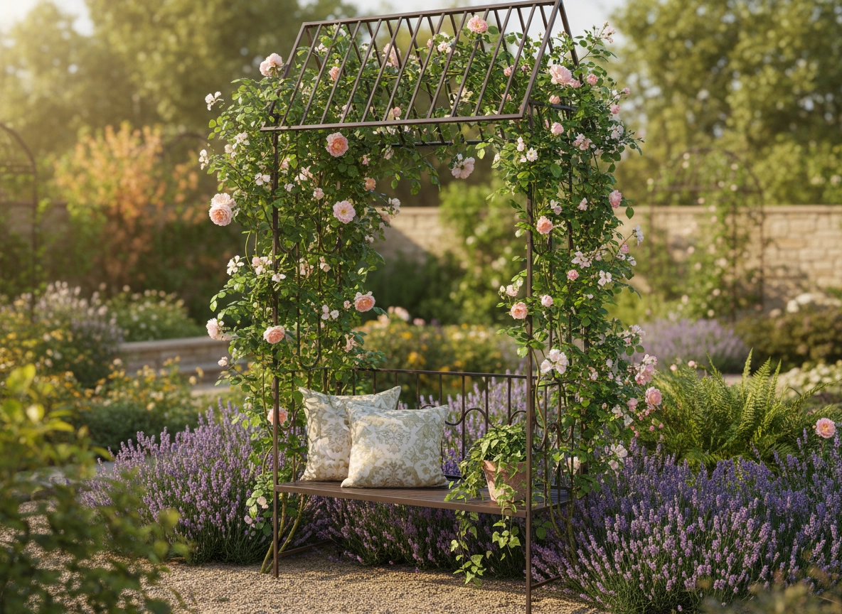 Součástí pergoly je stabilní lavice s opěrkou, která nabízí komfortní posezení uprostřed zeleně – ideální pro relax, čtení i posezení ve dvou.