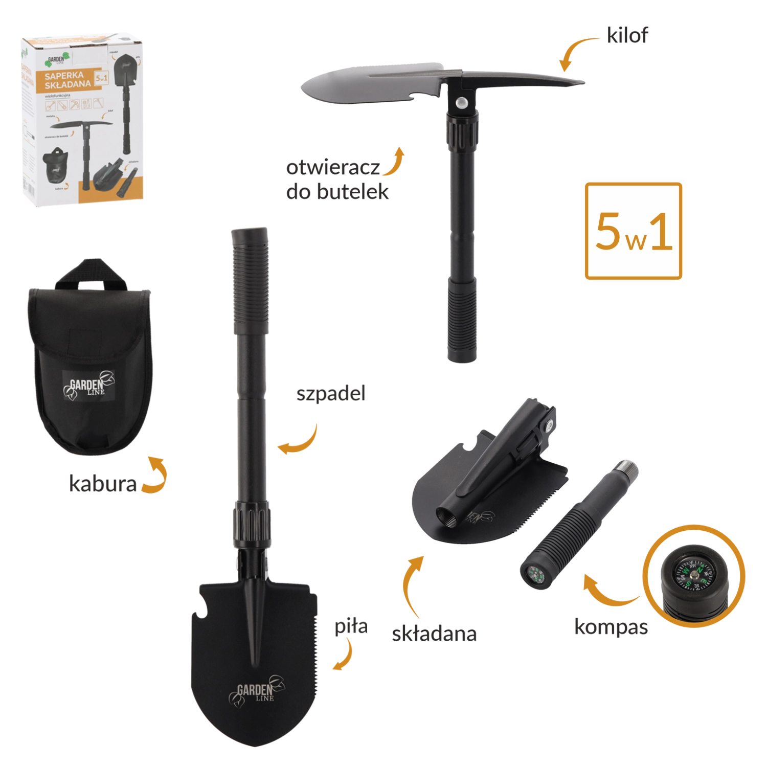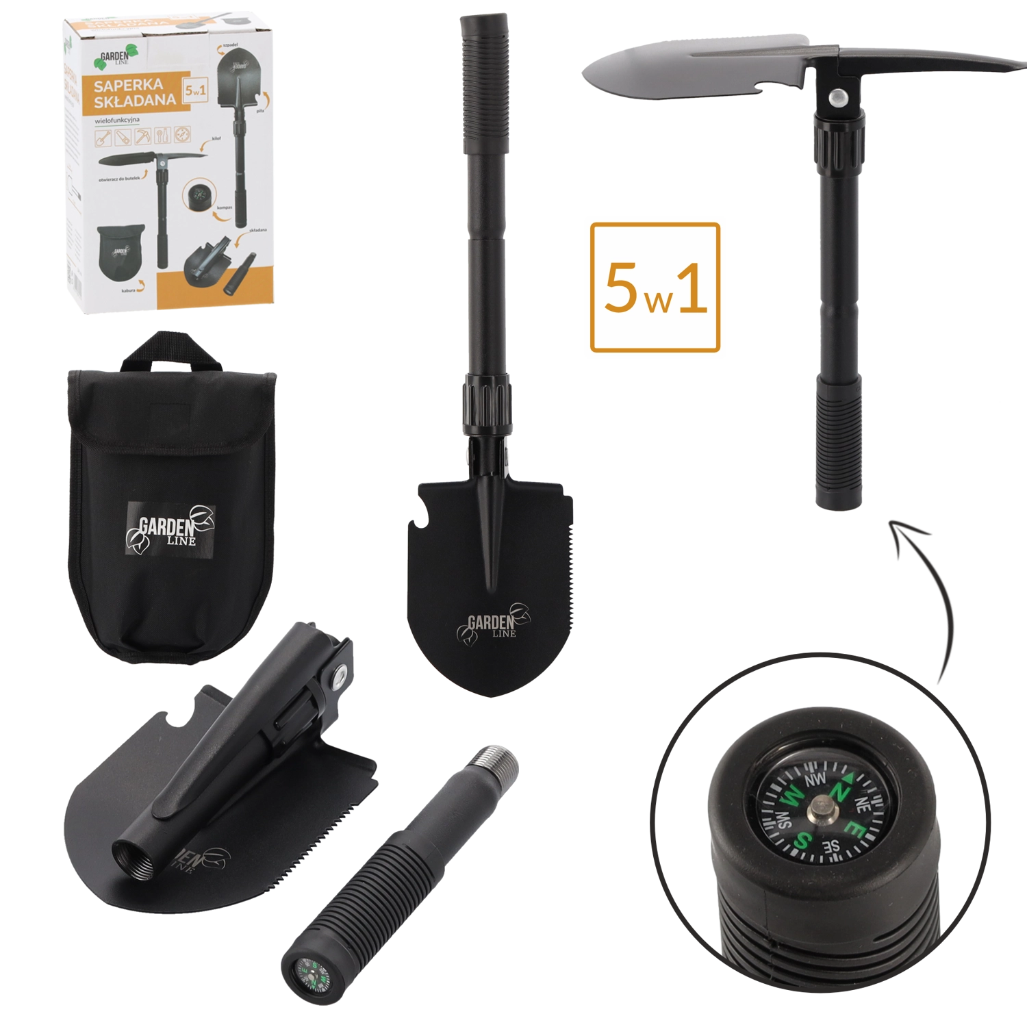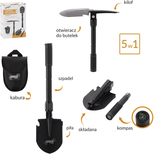 - 5 v 1: lopatka, krumpáč, pilka na okraji čepele, otvírák lahví, kompas