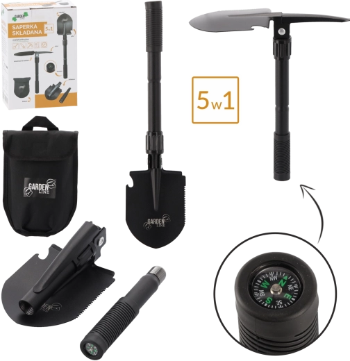 Kompaktní a odolná skládací lopatka 5 v 1 pro kempování, survival, auto i zahradu. Nabízí kopání, krumpáč, pilku, otvírák na láhve a kompas. Díky skládací konstrukci se vejde do batohu či auta, pevné materiály zaručují dlouhou životnost a spolehlivost v terénu.