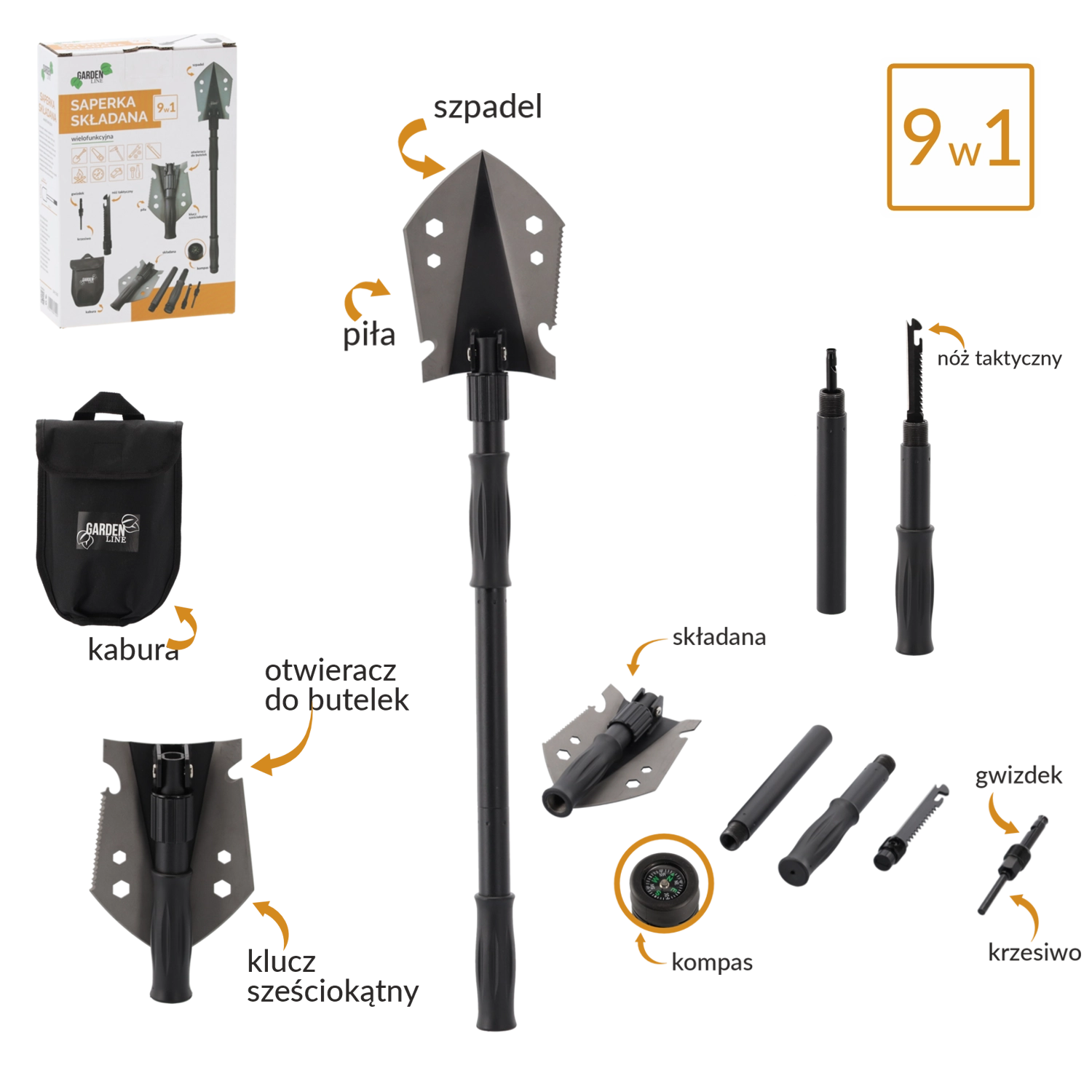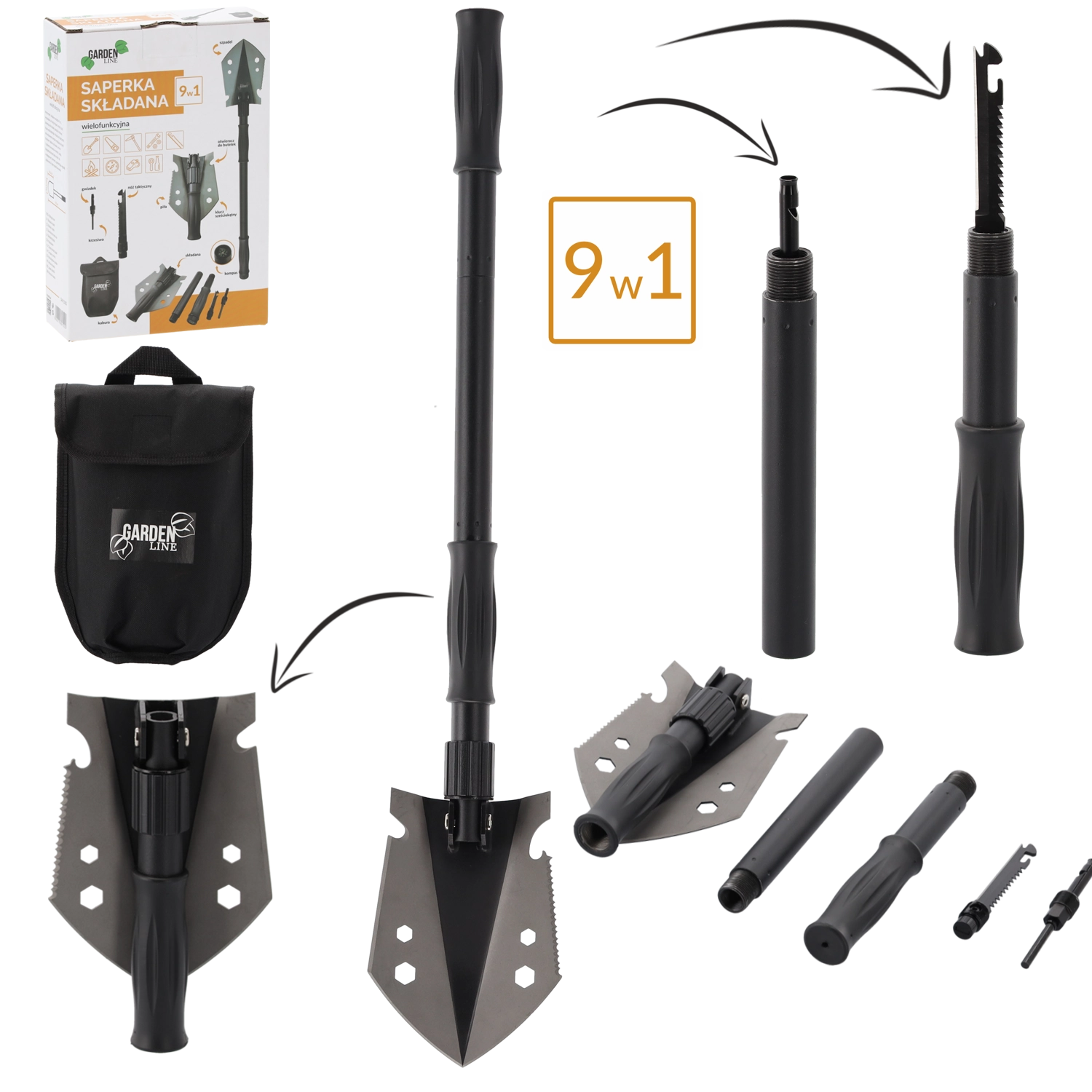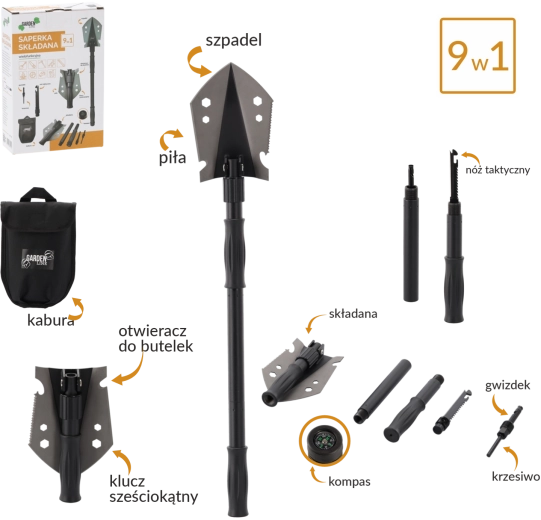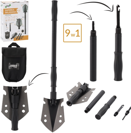 Multifunkční taktická lopatka 9v1 kombinuje kompaktní rozměry s vysokou odolností. Díky nerezové oceli čepele a uhlíkové oceli rukojeti zvládne kopání, řezání, páčení i práci v náročných podmínkách. Po složení měří jen 20,5 cm, po sestavení až 70 cm, takže je snadno přenosná a vždy připravená k akci.