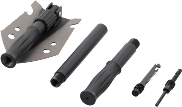 Kopání, páčení, řezání i příprava ohně. Lopatka, motyka, pila, šestihranný klíč, otvírák, nůž, křesadlo, píšťalka a kompas – vše po ruce.