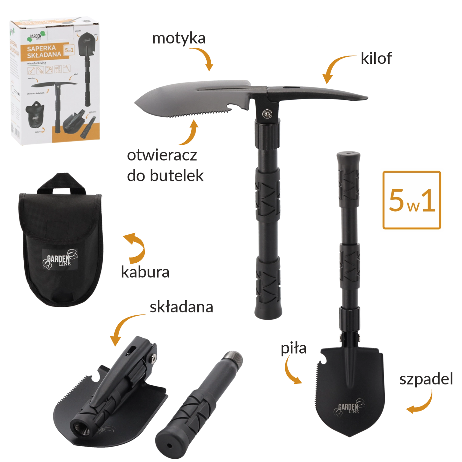 Díky skládací konstrukci se lopatka zmenší na pouhých 16 cm, takže se bez problému vejde do batohu či do přihrádky v autě. Uzamykací mechanismus kloubu drží nástroj pevně v zvolené poloze a texturované madlo poskytuje jistý úchop. Součástí je i odolné pouzdro pro bezpečné uložení a rychlé připnutí.