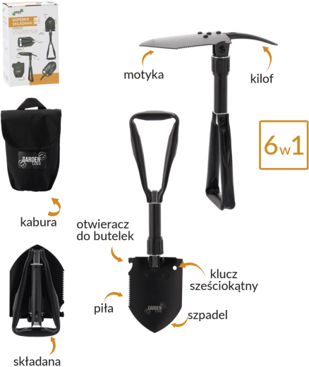 Lopatka, motyka, pilka, krumpáček, šestihranný klíč a otvírák lahví – univerzální vybavení pro kempování, survival i práci na zahradě.