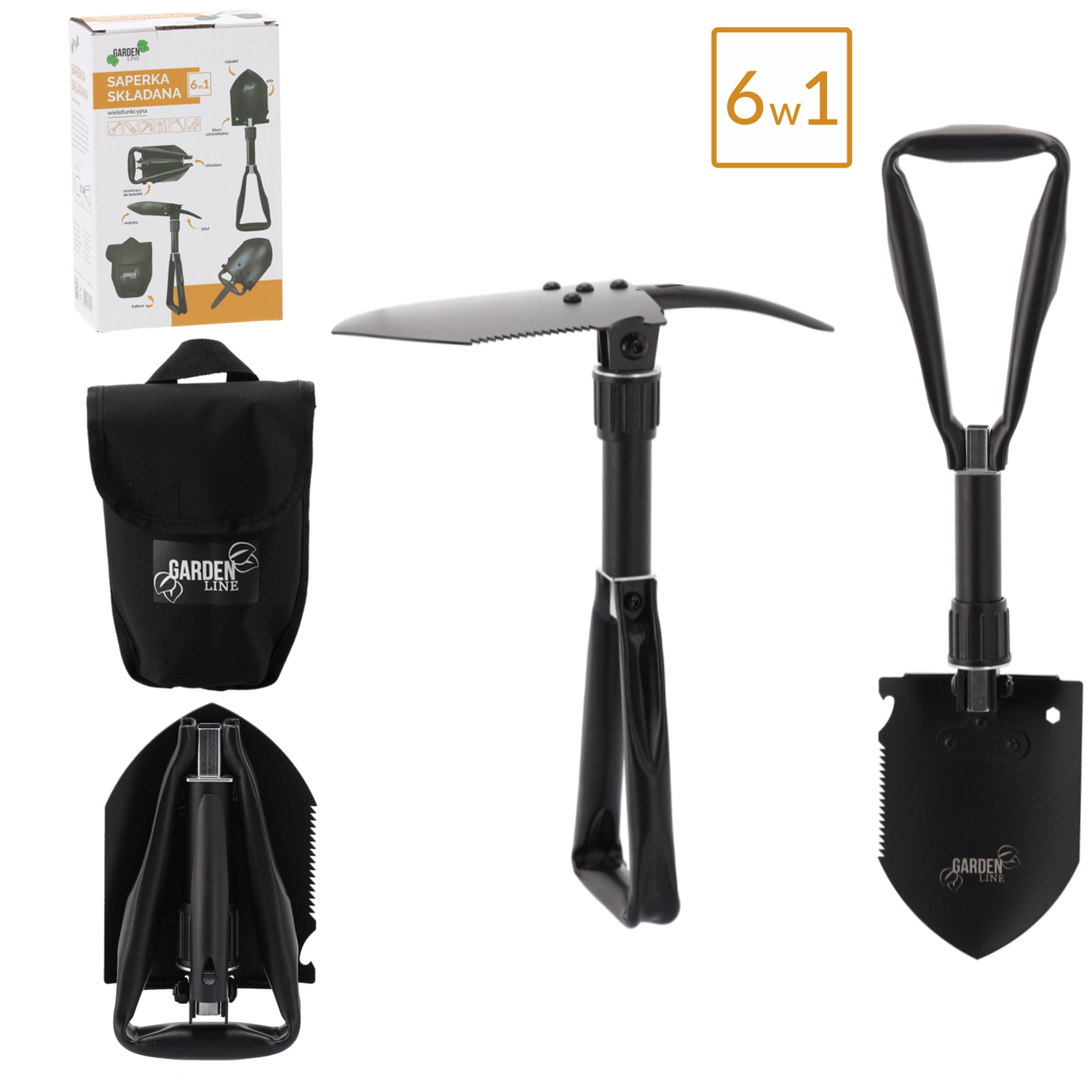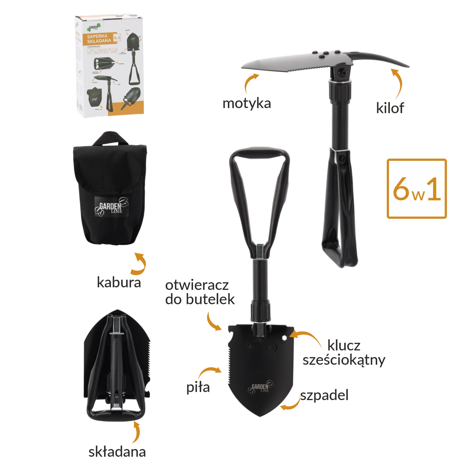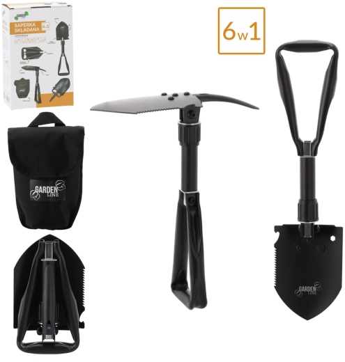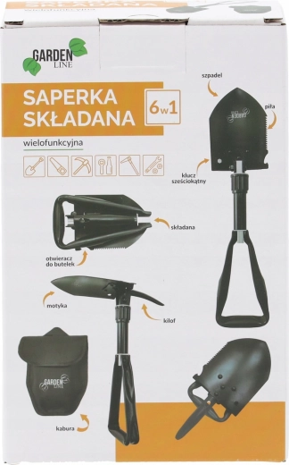 Tato odolná skládací saperka kombinuje lopatku, motyku, pilku, krumpáček, šestihranný klíč a otvírák lahví v jediném nástroji. Zvládne kopání, rozbíjení půdy, řezání kořenů a větví i drobné outdoorové práce. Ocelový list z manganové oceli s pilovým ostřím a uzamykatelný kloub zajistí stabilitu při zátěži.