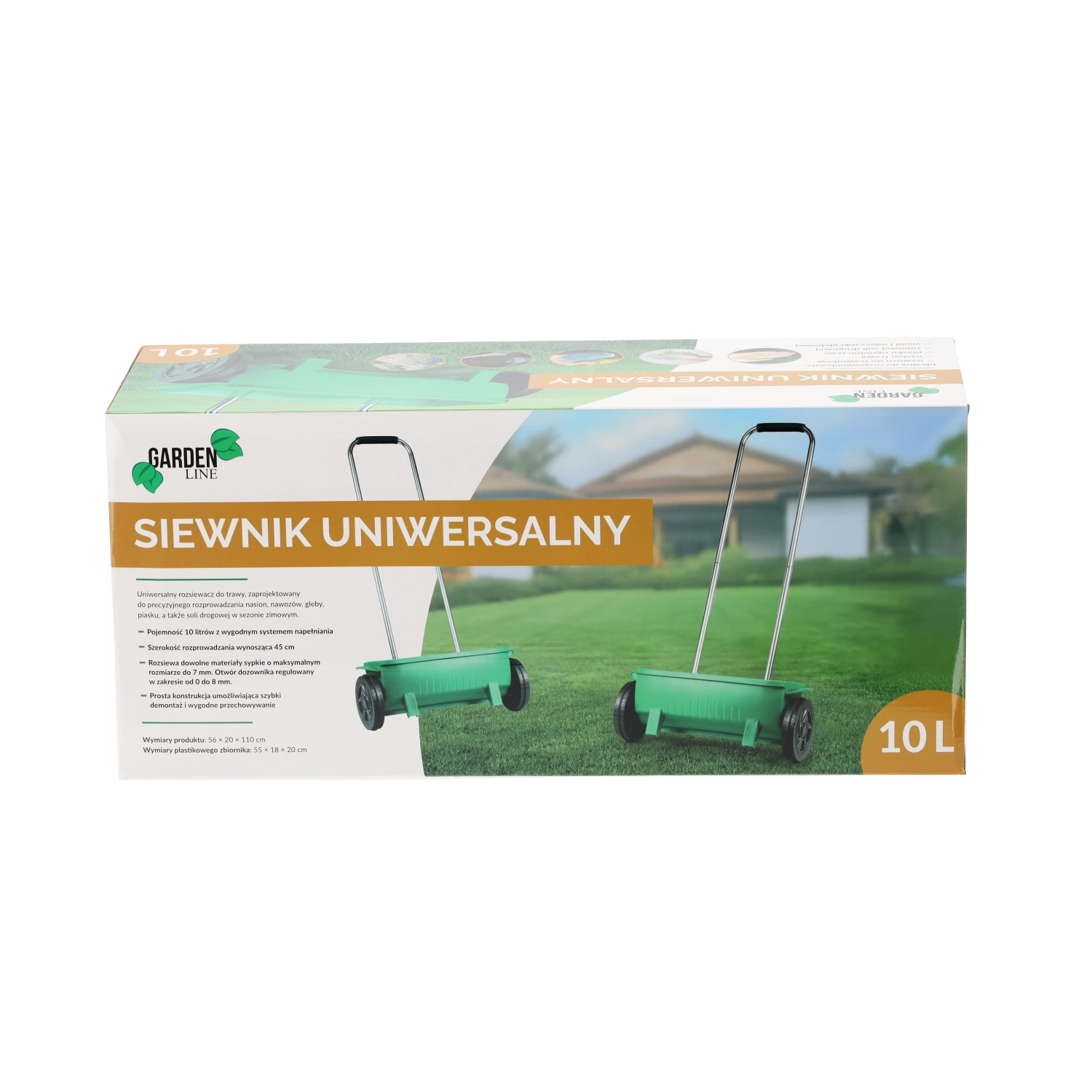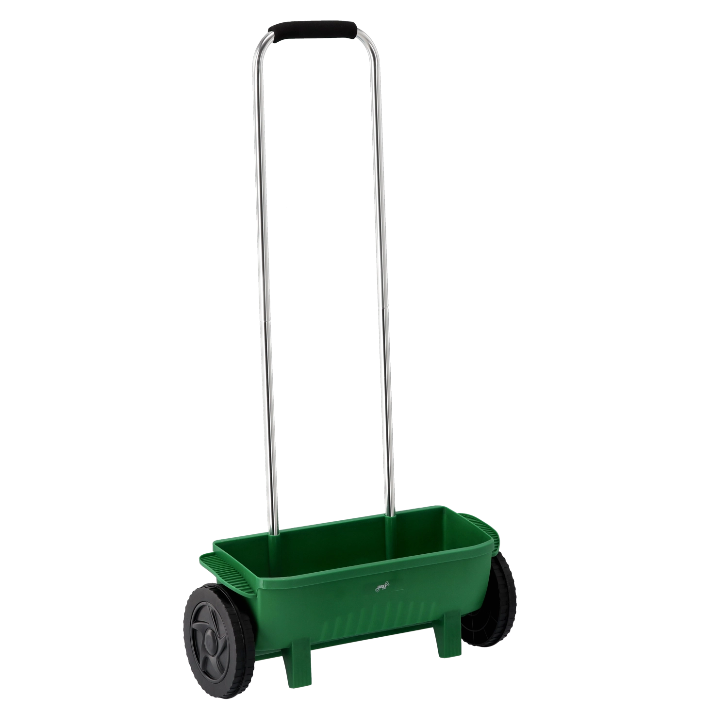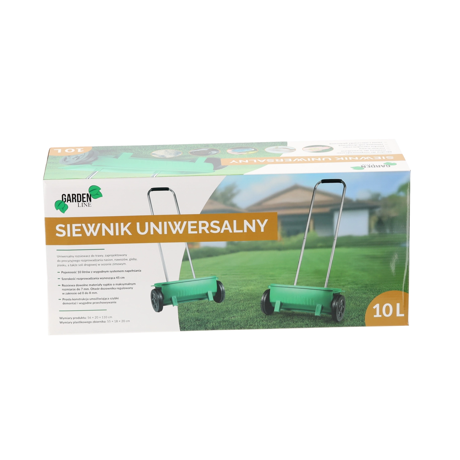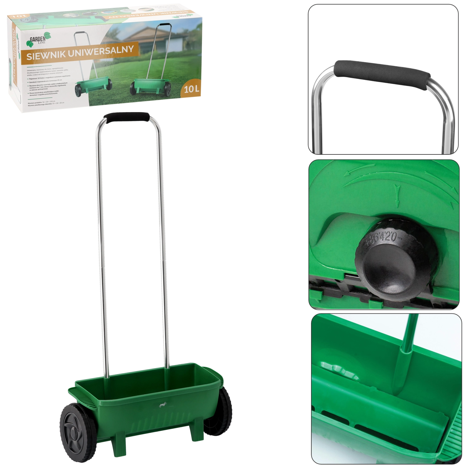 Praktické zahradní rozmetadlo pro přesné a konzistentní rozhozy po celé ploše trávníku i záhonů. Velký zásobník o objemu 10 l s odolným plastovým košem a robustními koly zajišťuje plynulý pohyb a stabilitu, zatímco ergonomická rukojeť přináší pohodlí i při delší práci.