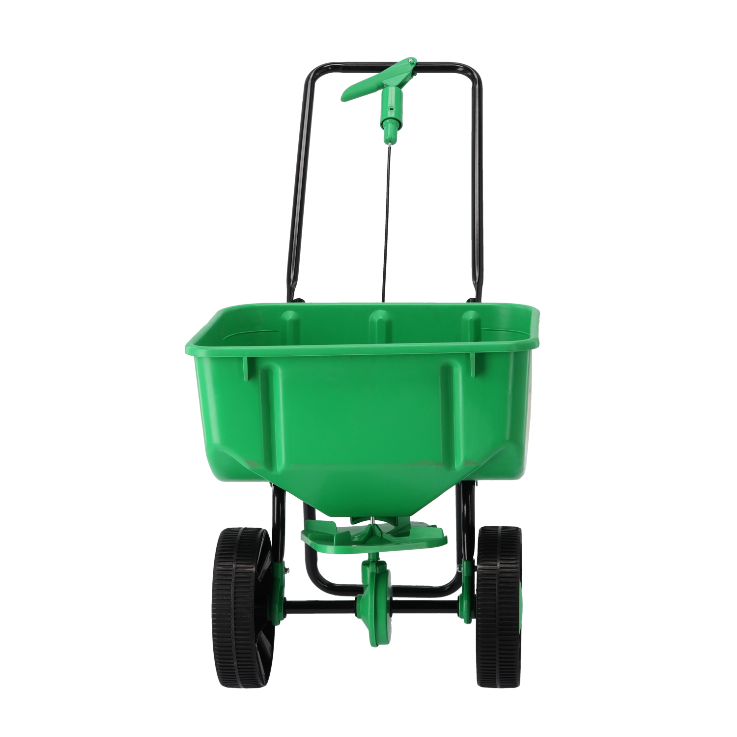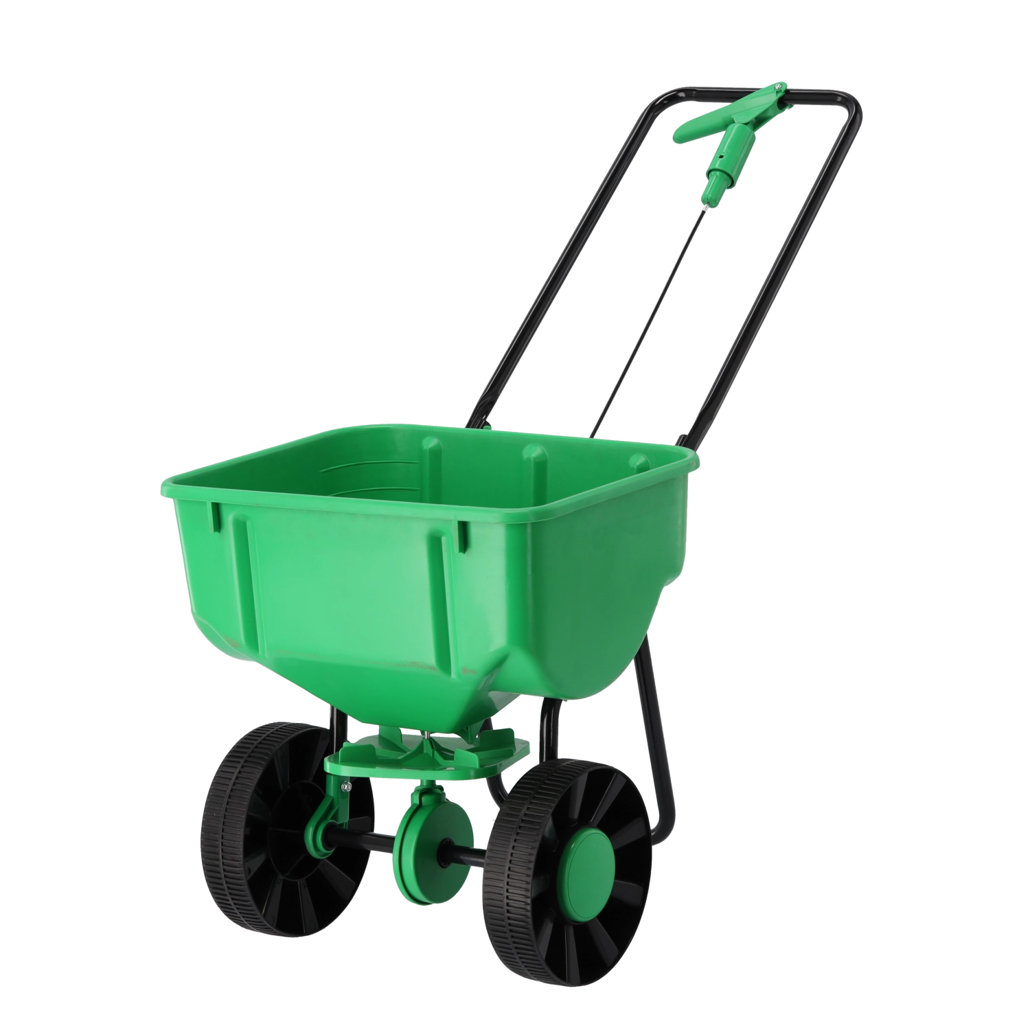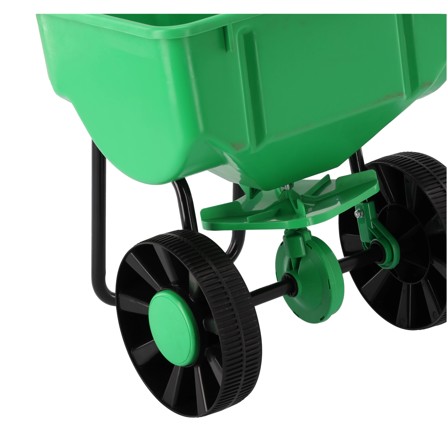 Velká kola zajišťují hladký pohyb a stabilitu, ovládací páčka u rukojeti umožňuje přesné nastavení průtoku pro rovnoměrný rozptyl.