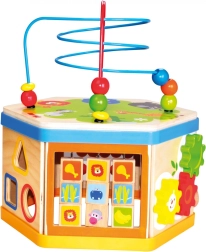 • 7 v 1: bludiště s korálky, počítadlo, posuvné ikony zvířátek, přiřazování potravy, ozubená kolečka, vkládačka tvarů, učení hodin