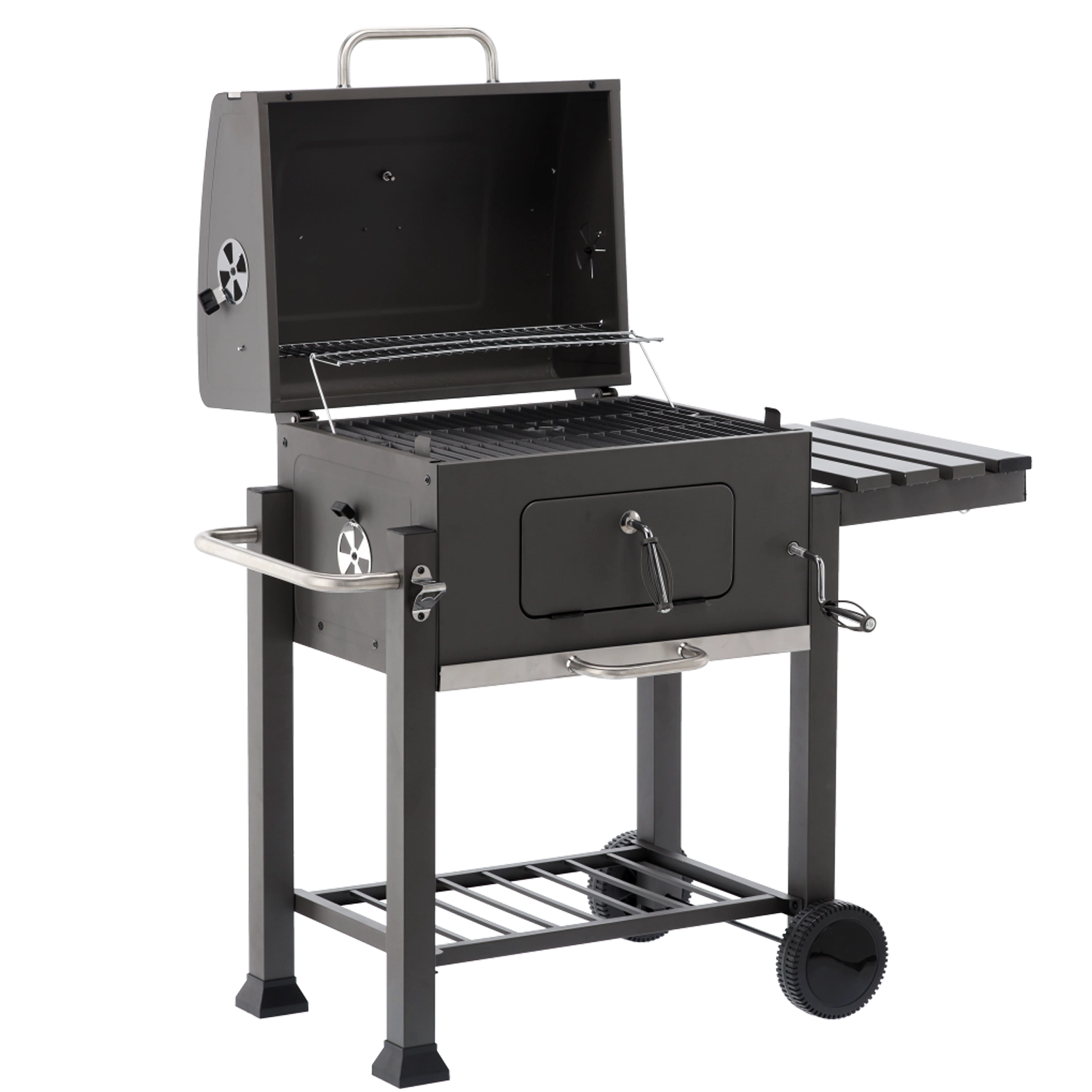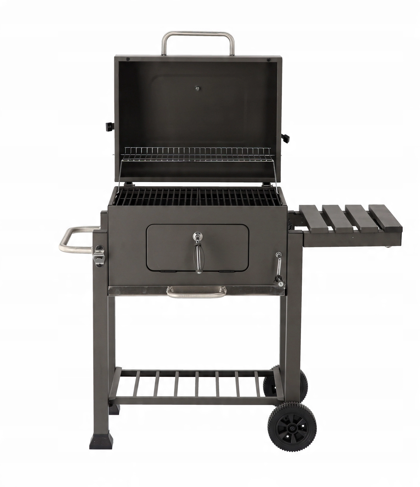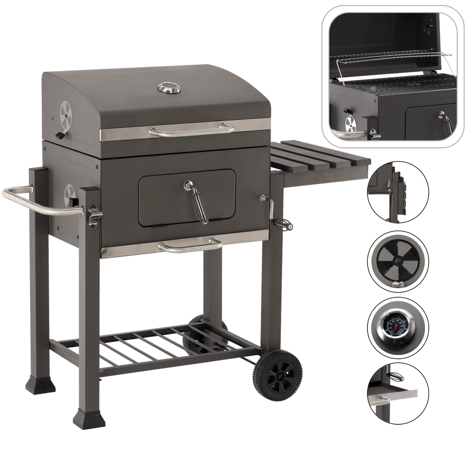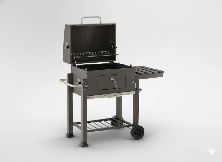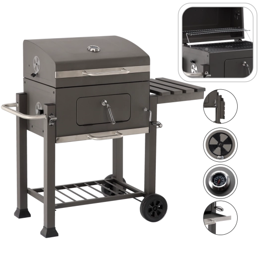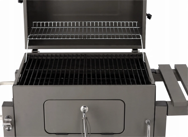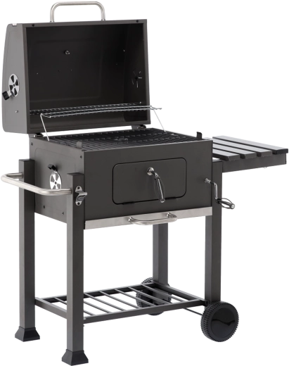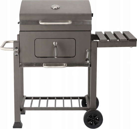 Robustní zahradní gril na dřevěné uhlí s litinovým roštem, vestavěným teploměrem a přenosnými kolečky pro snadné přesunutí. Nabízí velkou grilovací plochu, regulovatelnou výšku palivové vany pro přesnou kontrolu žáru a výsuvný popelník pro rychlé čištění. Praktická boční sklopná police zvětší odkládací prostor a kovová konstrukce s práškovým lakem zajišťuje dlouhou životnost.