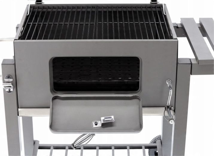 Díky regulaci výšky paliva snadno přizpůsobíte intenzitu žáru a výsuvný popelník urychlí úklid po grilování. Sklopná boční police poskytne místo pro suroviny a koření, zatímco kolečka a postranní madlo usnadní manipulaci. Gril je ideální pro rodinné oslavy i zahradní párty.