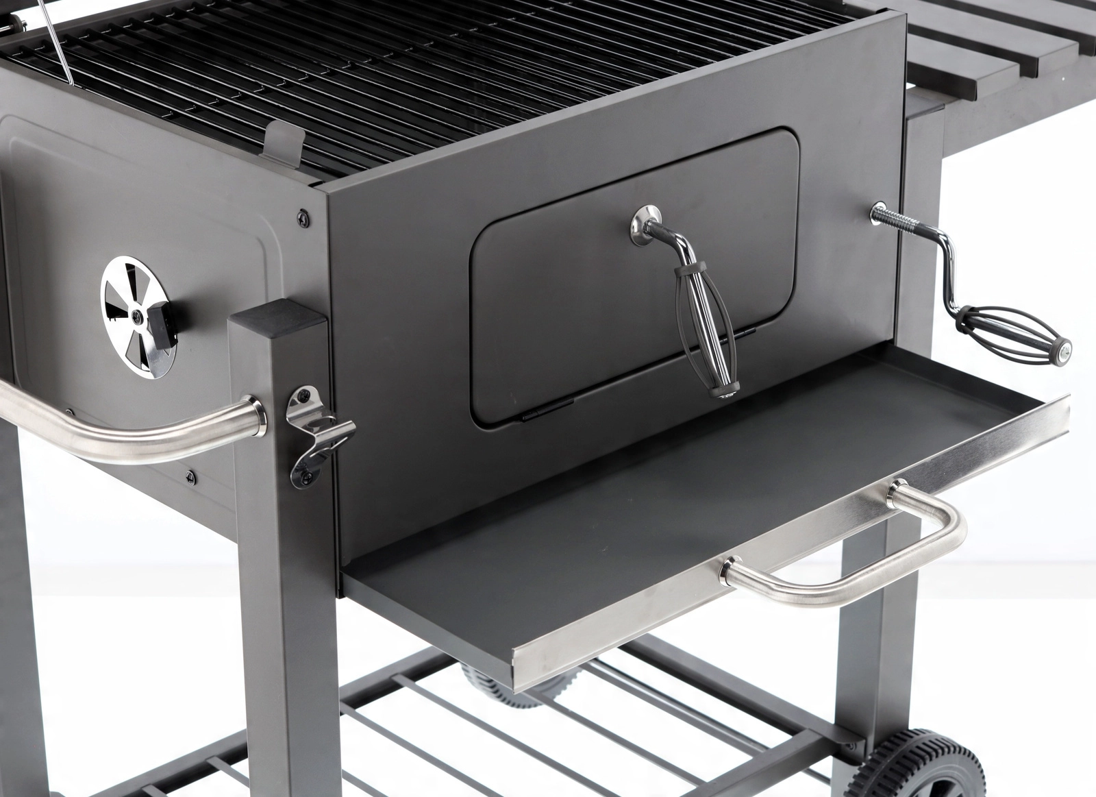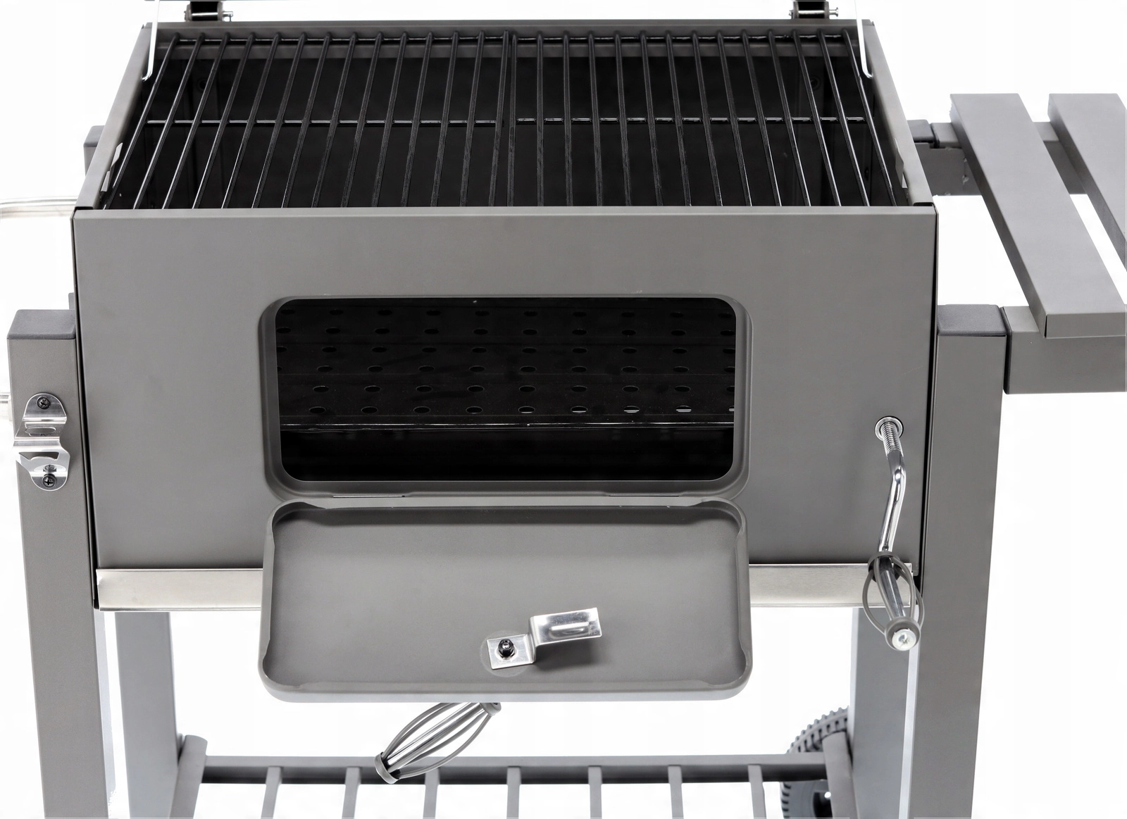 Výsuvný popelník urychlí úklid, přední dvířka usnadní doplňování uhlí a sklopná boční police nabídne extra pracovní plochu.
