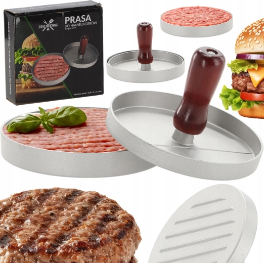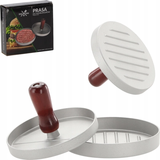 Tento praktický lis na burgery zaručuje jednotný tvar a tloušťku masových placek, takže se lépe propečou a na talíři vypadají profesionálně. Odolné hliníkové tělo ve stylové šedé barvě a pohodlná dřevěná rukojeť zajistí jistý úchop a dlouhou životnost.