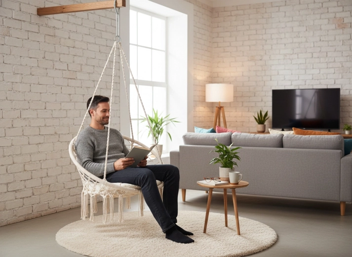 Toto závěsné křeslo ve stylu „bocianího hnízda“ je ideální pro relax po náročném dni. Díky měkkému polštáři a příjemnému tkanému sedáku si užijete pohodlí při čtení, odpočinku i jemném houpání. Neutrální béžová barva snadno ladí s moderním i boho interiérem.