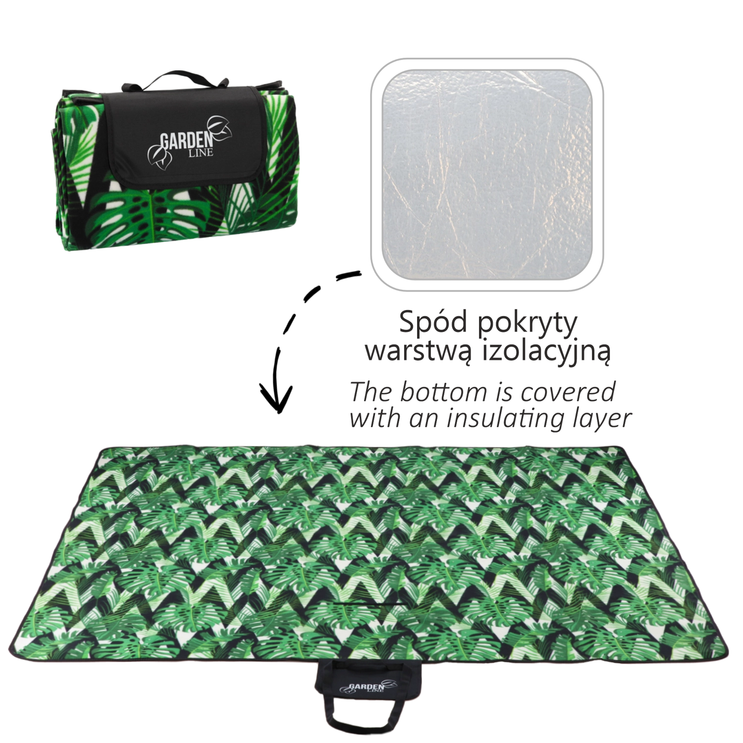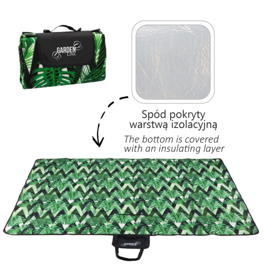 Užijte si piknik, výlet k vodě nebo relax na zahradě s dekou, která myslí na pohodlí i praktičnost. Horní měkká tkanina je příjemná na dotek, prostřední vrstva z pěny tlumí nerovnosti terénu a spodní izolační fólie chrání před vlhkostí a chladem. Tropický vzor Monstera dodá vašemu posezení styl.