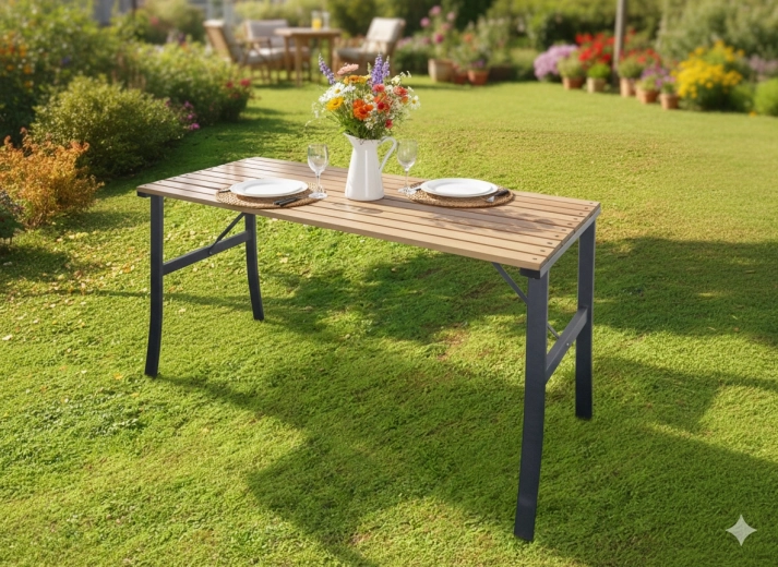 Vsaďte na spojení přirozené estetiky a funkčnosti. Tento zahradní stůl s masivním dřevěným lamelovým plátem a tmavým ocelovým rámem přináší čistý, nadčasový vzhled do každého exteriéru. Je skvělou volbou pro každodenní posezení u kávy i víkendové grilování.