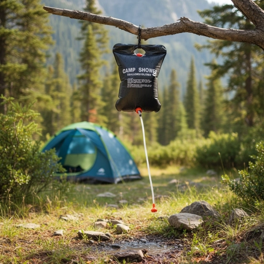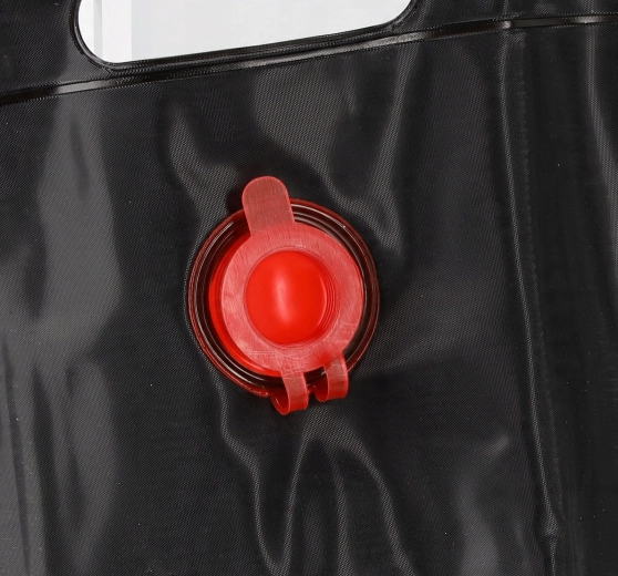 Černý vak efektivně absorbuje sluneční záření a ohřívá vodu během dne – ideální pro komfortní sprchu v kempu či na výletě.