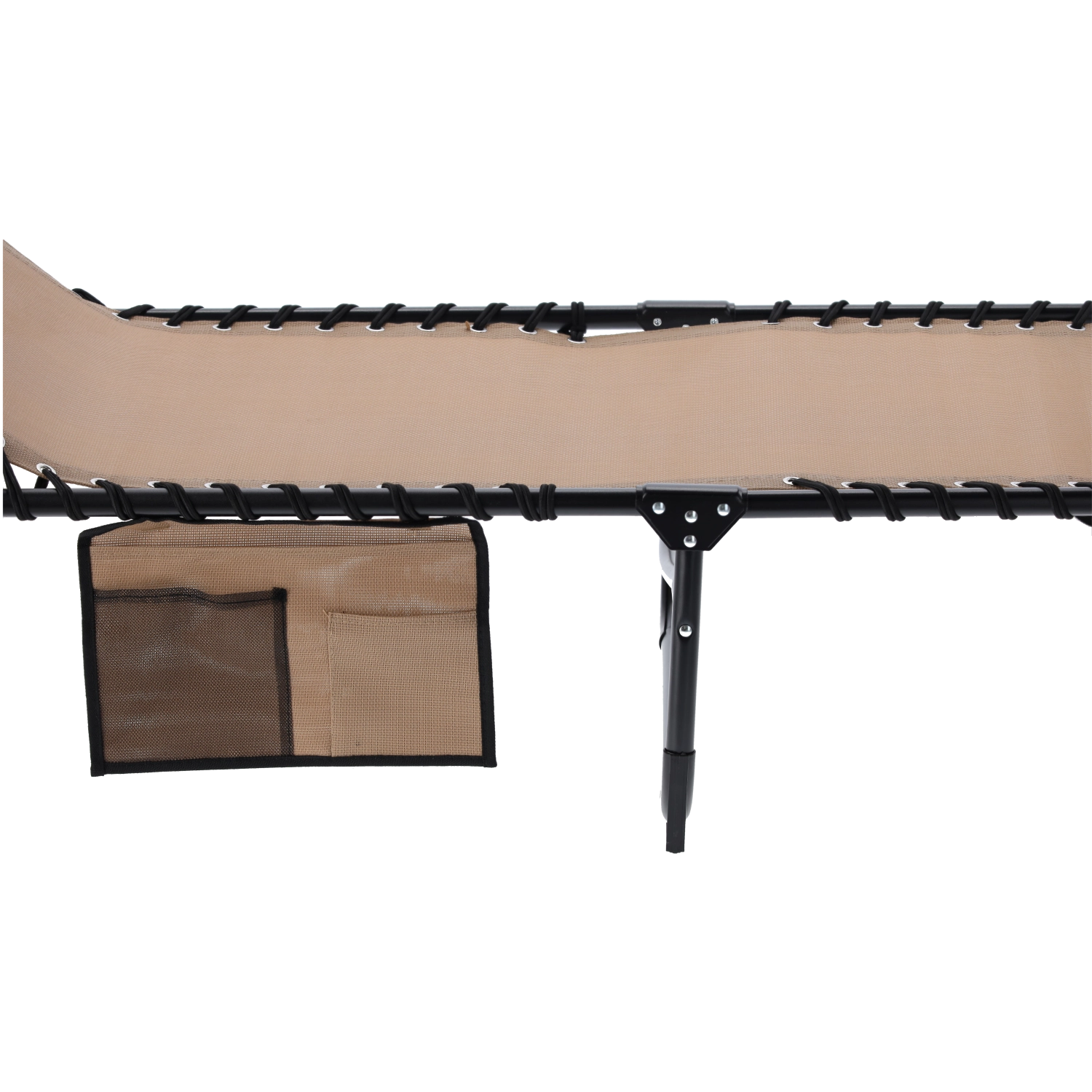 Díky stabilním kovovým nohám a odolné tkanině je lehátko připravené na časté používání venku. Postranní kapsa udrží telefon, knihu či brýle po ruce a skládací rám usnadní přenášení i skladování.