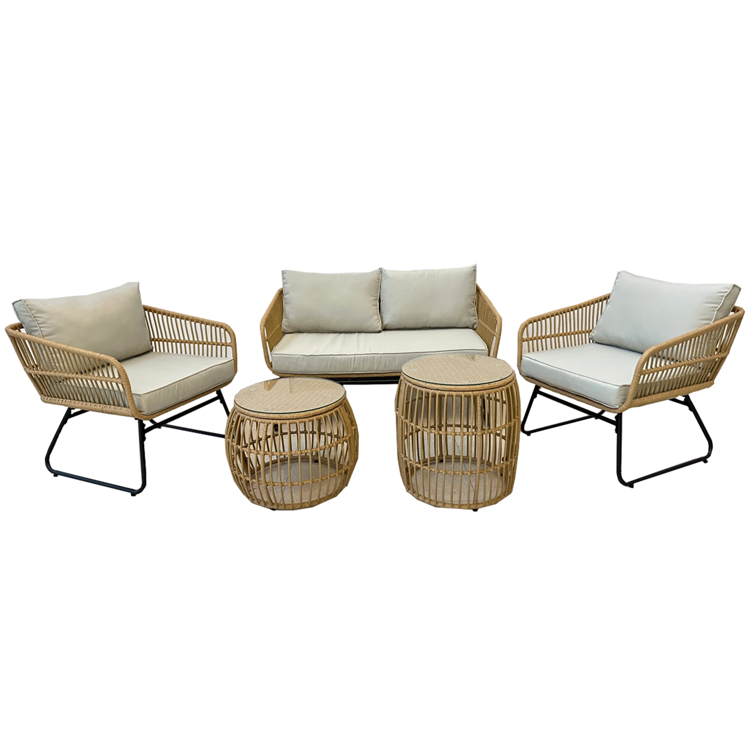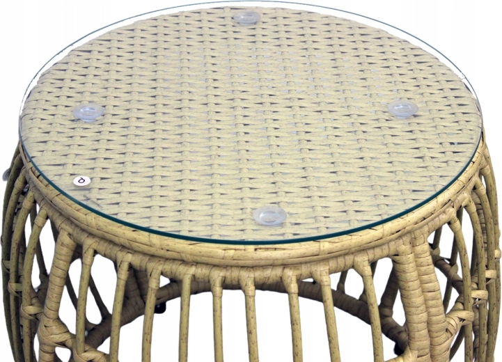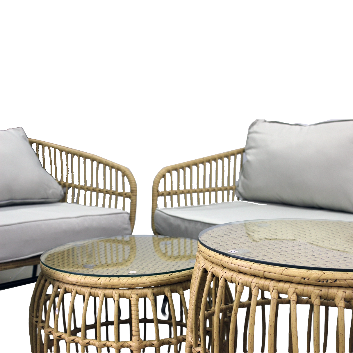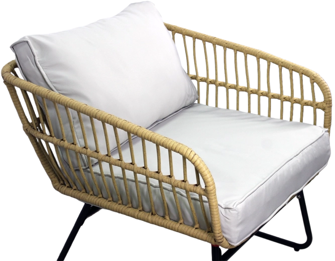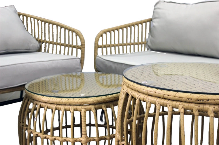 Stolky jsou osazeny 5mm tvrzeným sklem pro vyšší odolnost proti poškrábání a stabilitu. Robustní rám ze zinkované oceli zvyšuje životnost a nosnost celé sestavy – křeslo až 110 kg, sedačka 200 kg, stolky 30 kg. Neutrální barevné ladění v odstínu přírodního ratanu s šedými polštáři snadno sladíte s ostatním venkovním nábytkem.