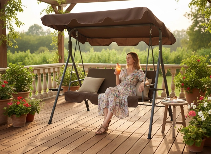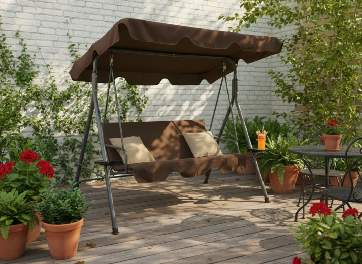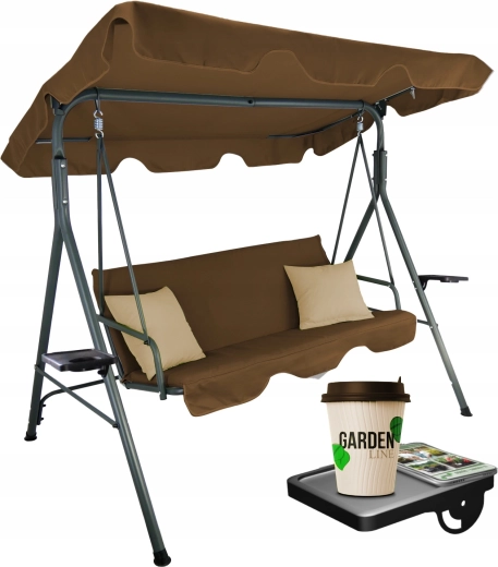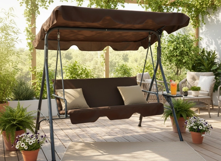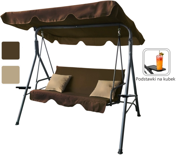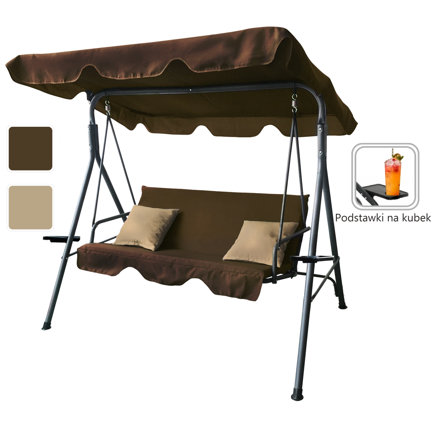 Tato elegantní zahradní houpačka v hnědém provedení s béžovými polštáři se skvěle hodí na terasu, balkon i do pergoly. Díky pevné ocelové konstrukci s práškovým lakem a voděodolnému polyesteru odolá běžným povětrnostním vlivům a zároveň poskytne příjemný stín a pohodlí při odpočinku.