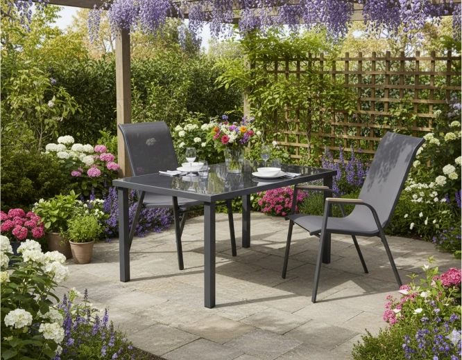 Vytvořte si stylové venkovní posezení s hliníkovým stolem v šedém provedení. Díky práškově lakovanému rámu je stůl odolný proti korozi a povětrnostním vlivům, zatímco tvrzené sklo na desce dodává moderní vzhled a praktičnost při každodenním používání.