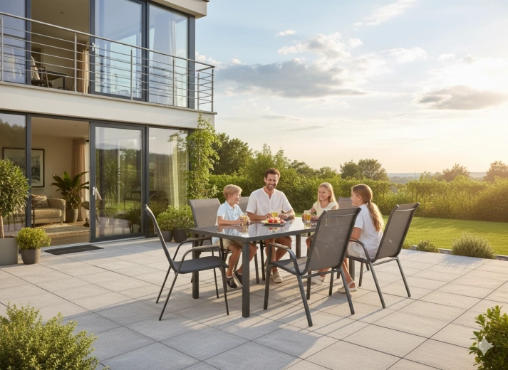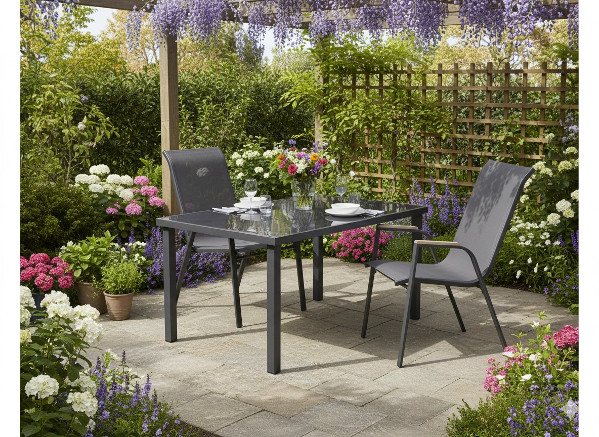 Moderní zahradní stůl z hliníku se skleněnou deskou kombinuje lehkou, ale stabilní konstrukci, odolnost vůči počasí a snadnou údržbu. Prostorná deska 150 × 90 cm z 5mm tvrzeného skla je elegantní, hladká a snadno se čistí. Ideální pro terasu, zahradu i balkon.