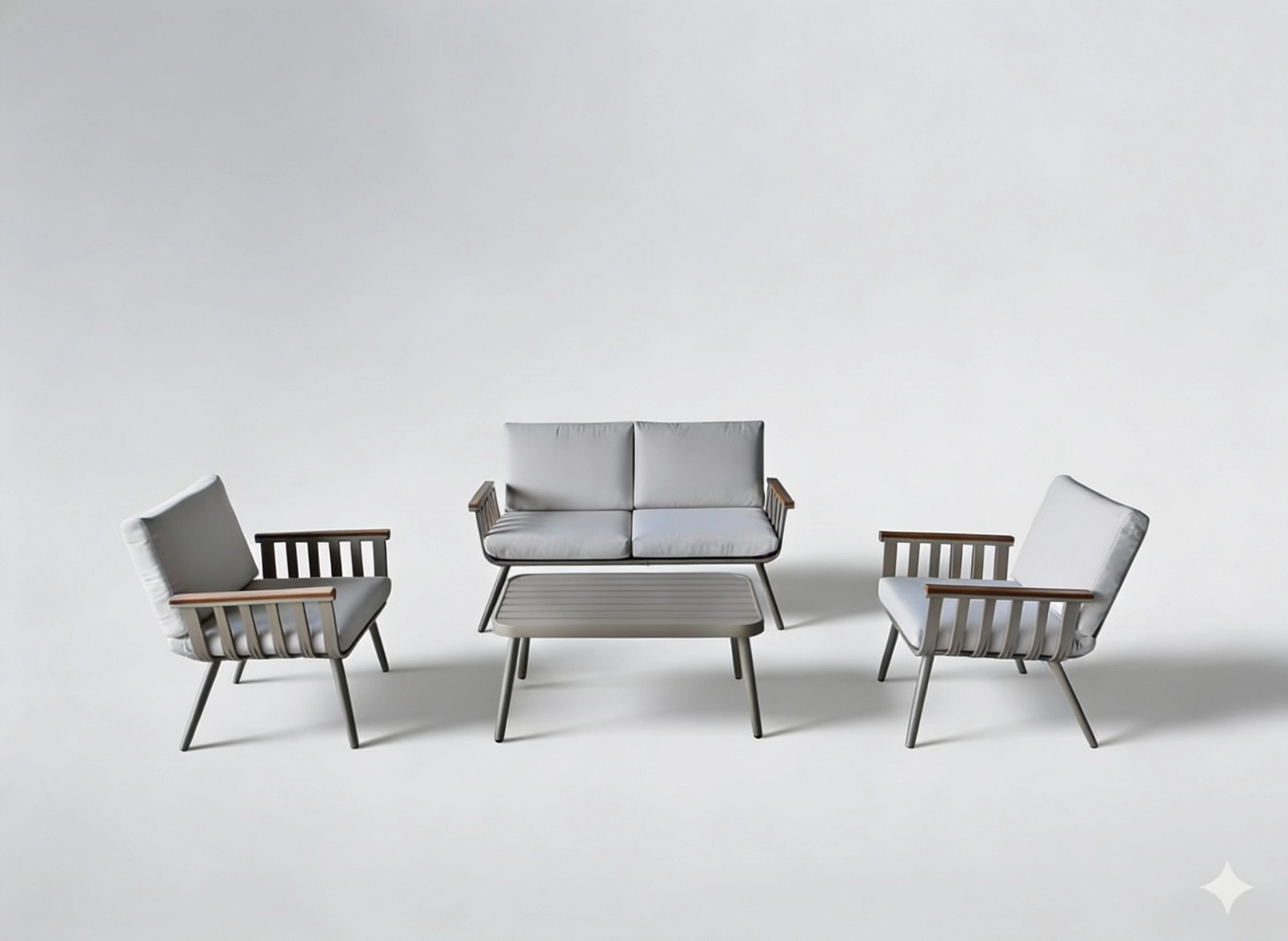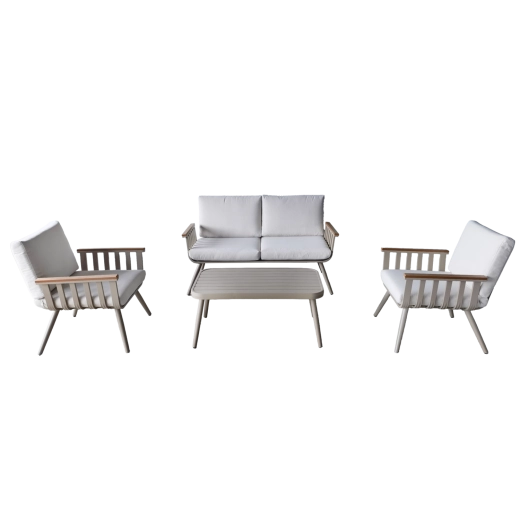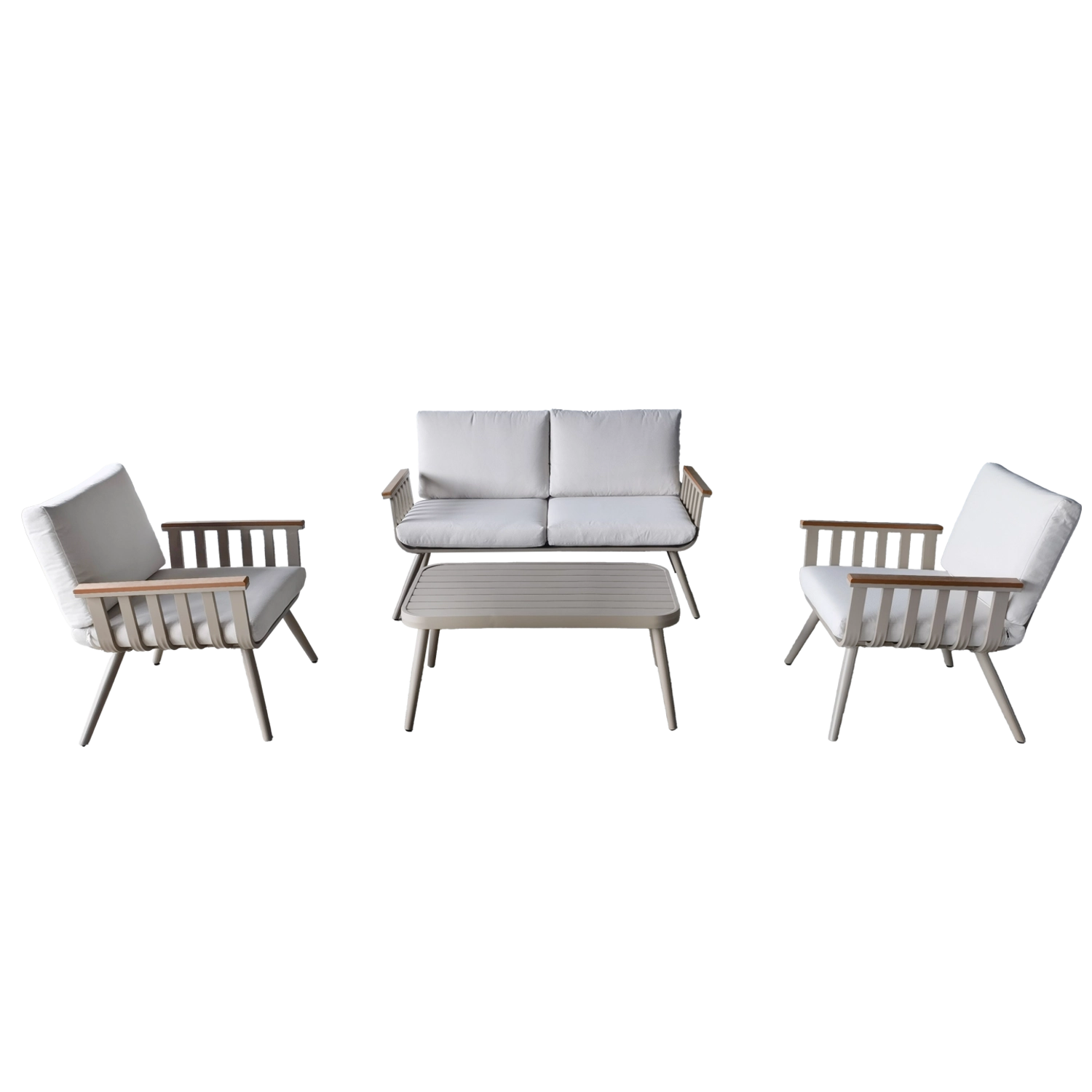 Elegantní a pohodlná zahradní souprava pro 4 osoby promění váš balkon, terasu či patio v oázu klidu. Set obsahuje dvoumístnou pohovku, 2 křesla a konferenční stolek. Odolný hliníkový rám, područky s dekorem dřeva a měkké béžové podušky zajistí dlouhou životnost i komfort. Potahy z spunpoly 220 g jsou odolné vůči UV záření a vlhkosti.