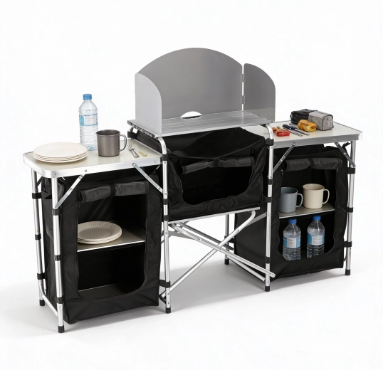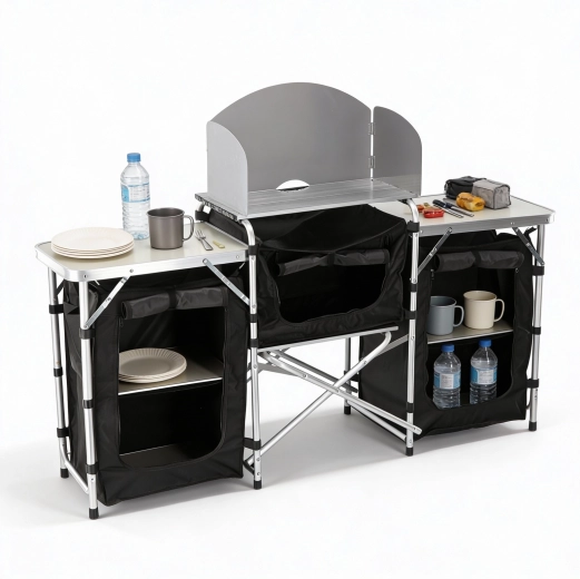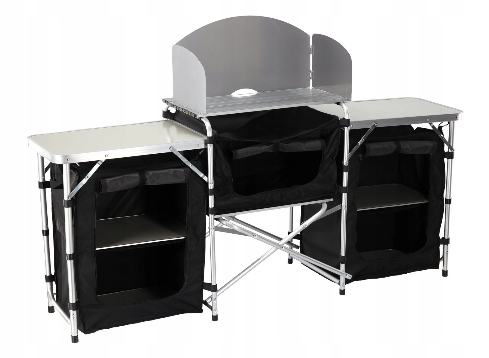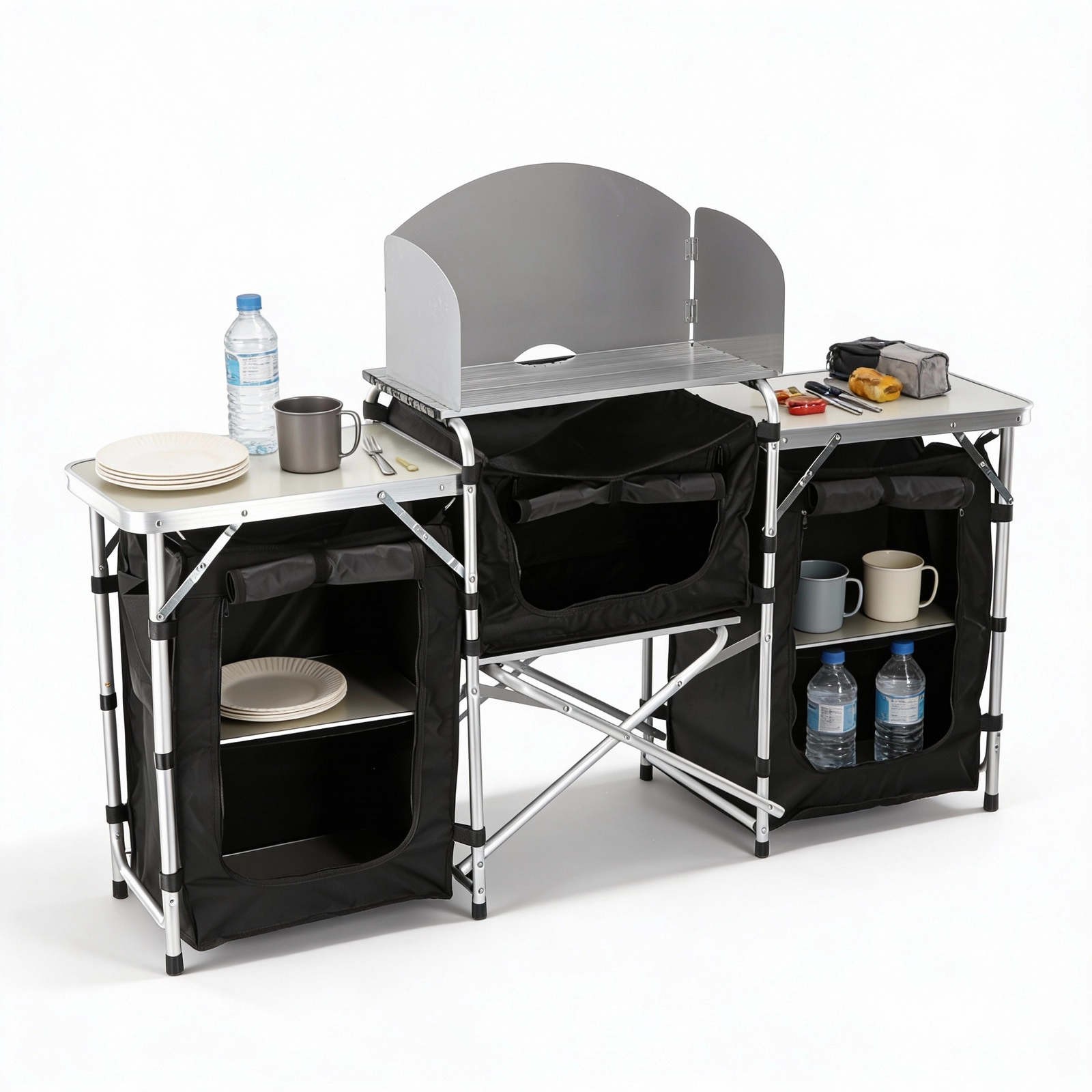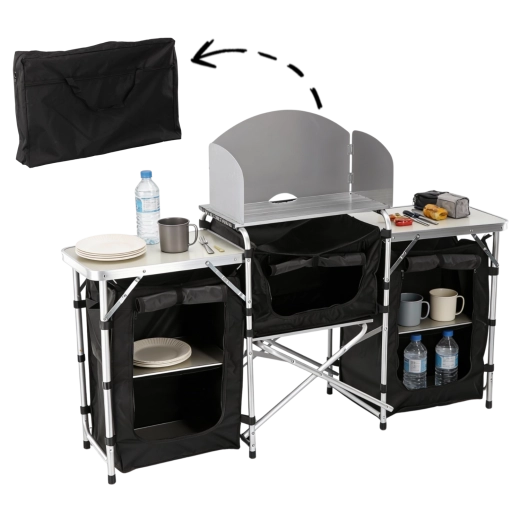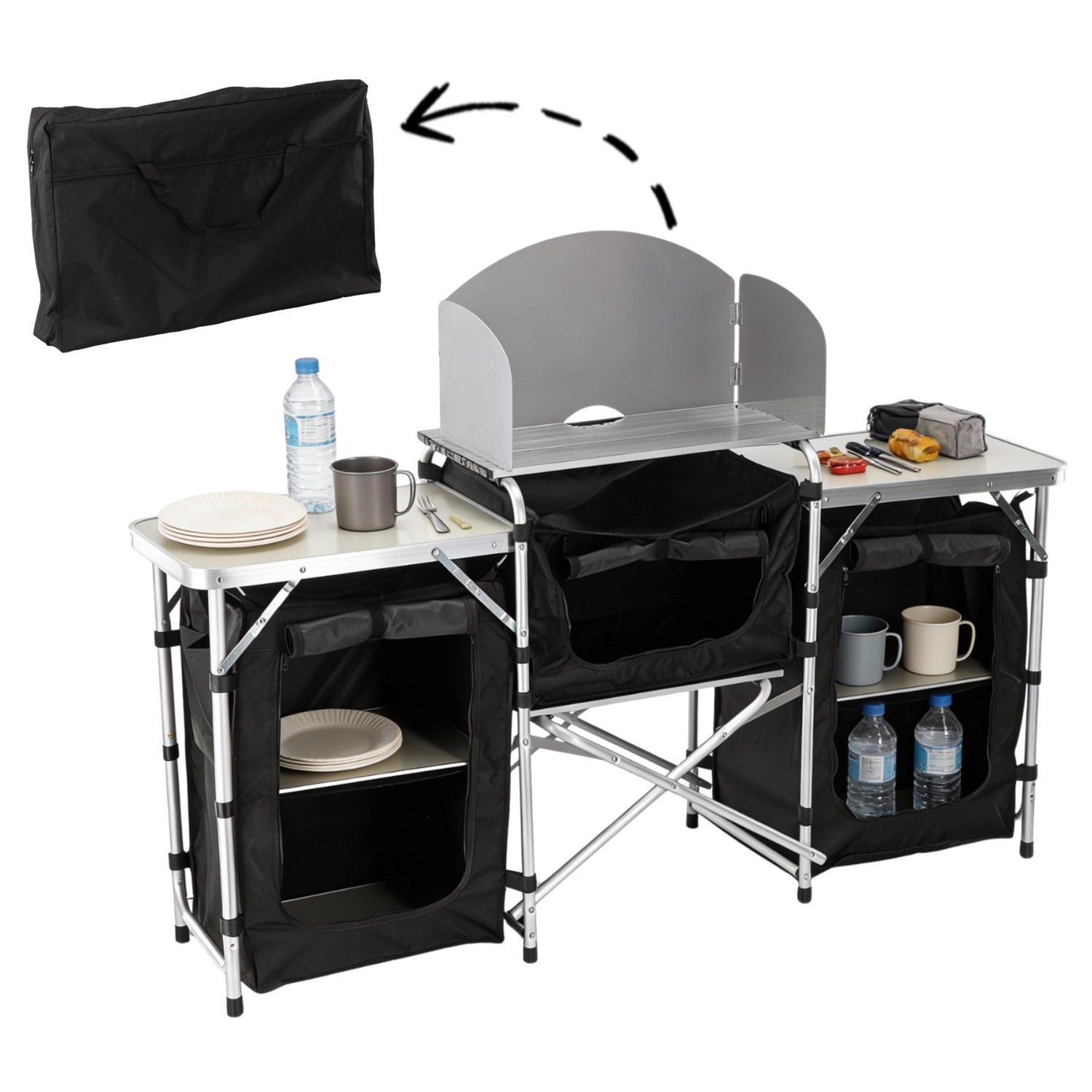 Praktická a přenosná kempingová kuchyně pro pohodlné vaření v přírodě. Nabízí stabilní pracovní plochy, odolný hliníkový rám, integrovanou zástěnu proti větru a prostorné textilní skříňky s policemi pro přehledné uložení nádobí a potravin. Snadno se skládá, lehce se přenáší a zajistí pořádek i komfort při vaření na cestách.