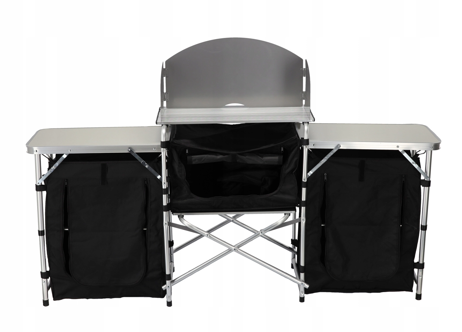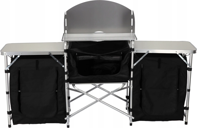 Tato skládací kempingová kuchyně promění každý kemp, zahradu nebo piknik v dobře organizované kulinární zázemí. Díky hliníkové konstrukci je lehká, ale stabilní, pracovní desky poskytnou dostatek místa na přípravu jídel a zástěna proti větru ochrání plamen vařiče. Dvě až tři textilní skříňky se zipy a policemi udrží vybavení vždy po ruce a v suchu.