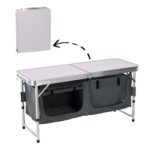 Skříňka se během chvilky rozloží i složí do kufříkového tvaru, takže se snadno přenáší a nezabírá místo v autě či karavanu. Ideální pro kempování, zahradu, pikniky i jako mobilní kuchyňskou stanici u obytného vozu.
