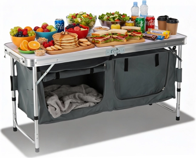 Prostorný plát poskytne pohodlné místo pro krájení a servírování, zatímco dvě textilní skříně se zipy udrží potraviny a nádobí čisté a po ruce.