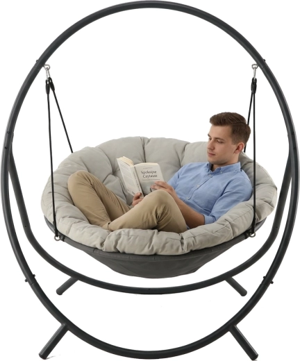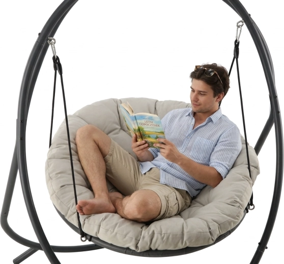 Elegantní závěsné křeslo s velkým kruhovým sedákem promění každý balkon, terasu či zahradu v místo pohody. Silně polstrovaný polštář v béžové barvě a šedý kovový stojan vytvářejí nadčasovou kombinaci, která se hodí k modernímu i přírodnímu stylu.