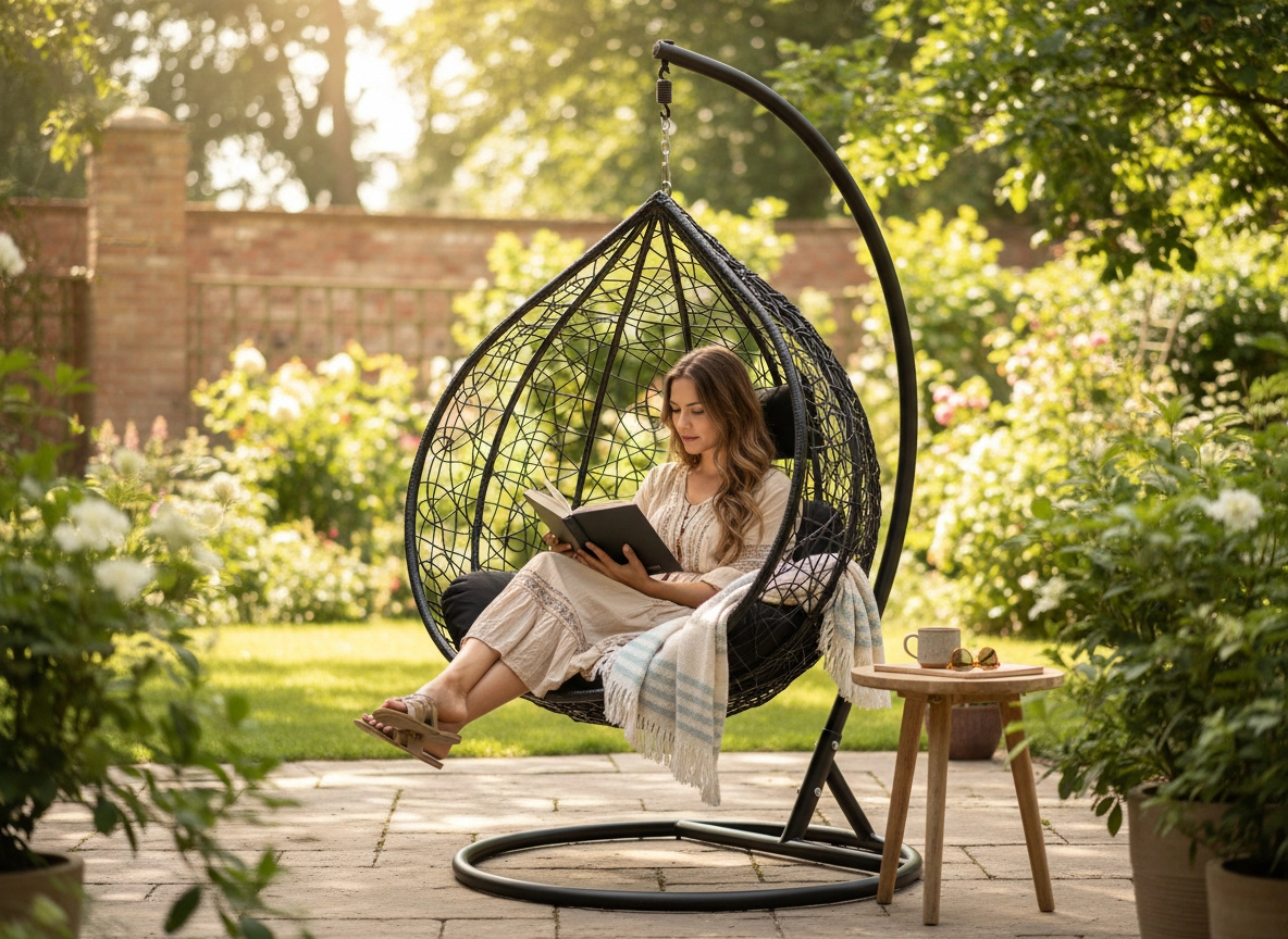 Pro maximální komfort je křeslo vybaveno měkkým sedákem a opěrkou hlavy. Zavěšení na hák s řetězem umožňuje jemné houpání, které uklidňuje a podporuje regeneraci po náročném dni.