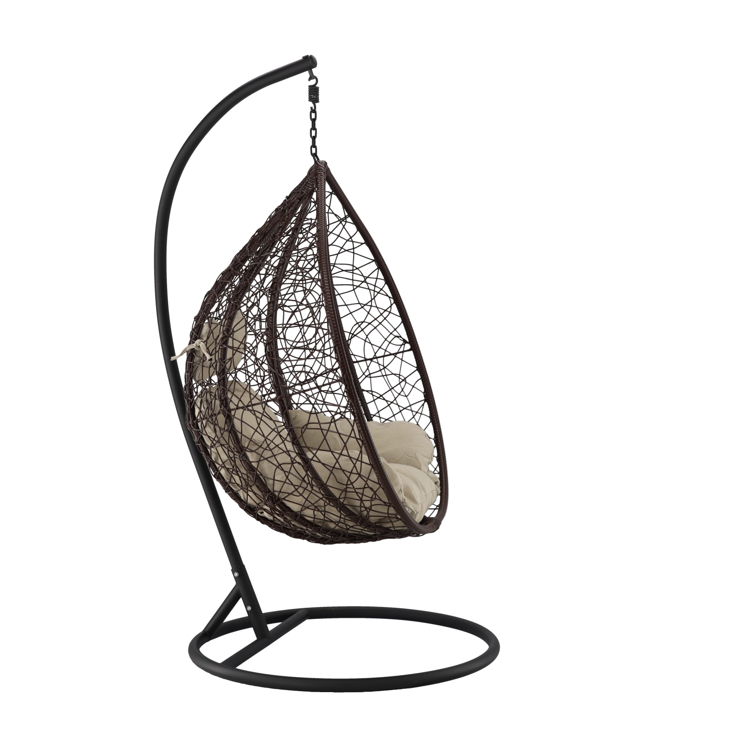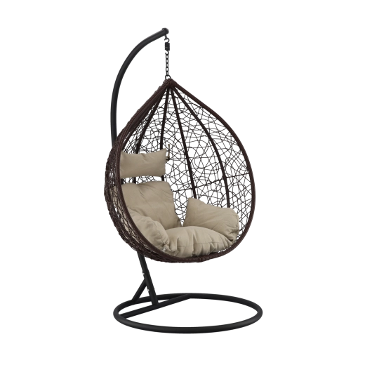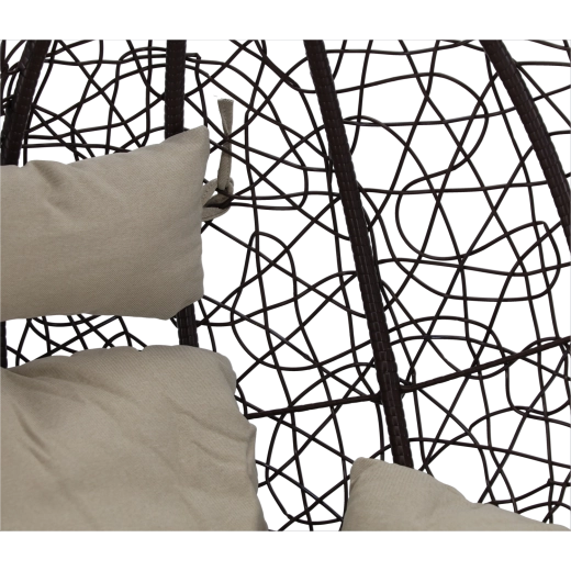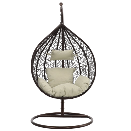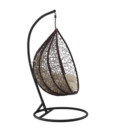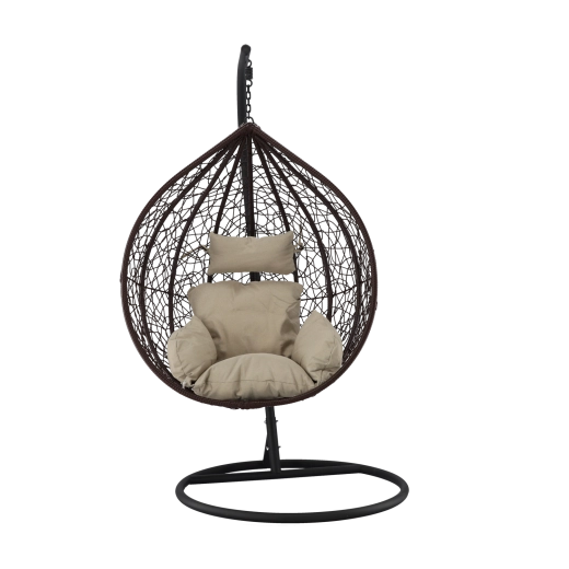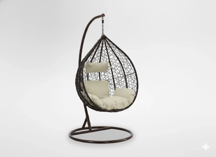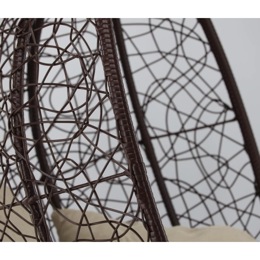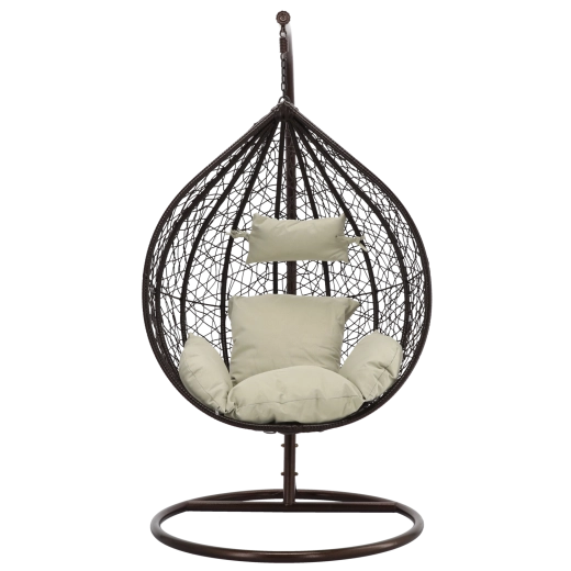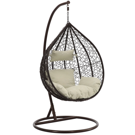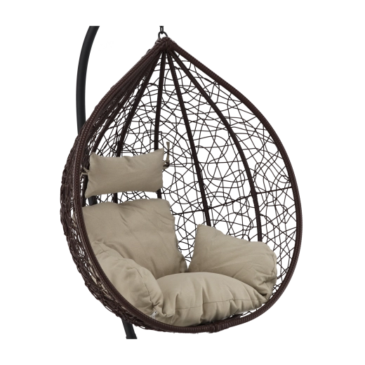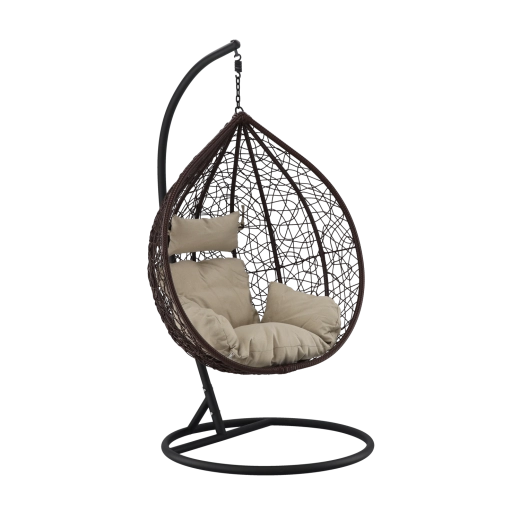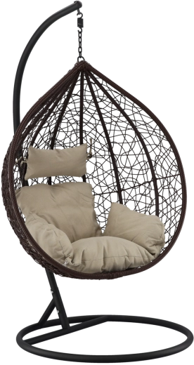 Užijte si dokonalý odpočinek v elegantním závěsném vajíčkovém křesle s hnědým rámem a pohodlnými béžovými polštáři. Odolný technoratan, stabilní ocelová konstrukce a nosnost 150 kg z něj dělají ideální volbu na terasu, zahradu i do interiéru.