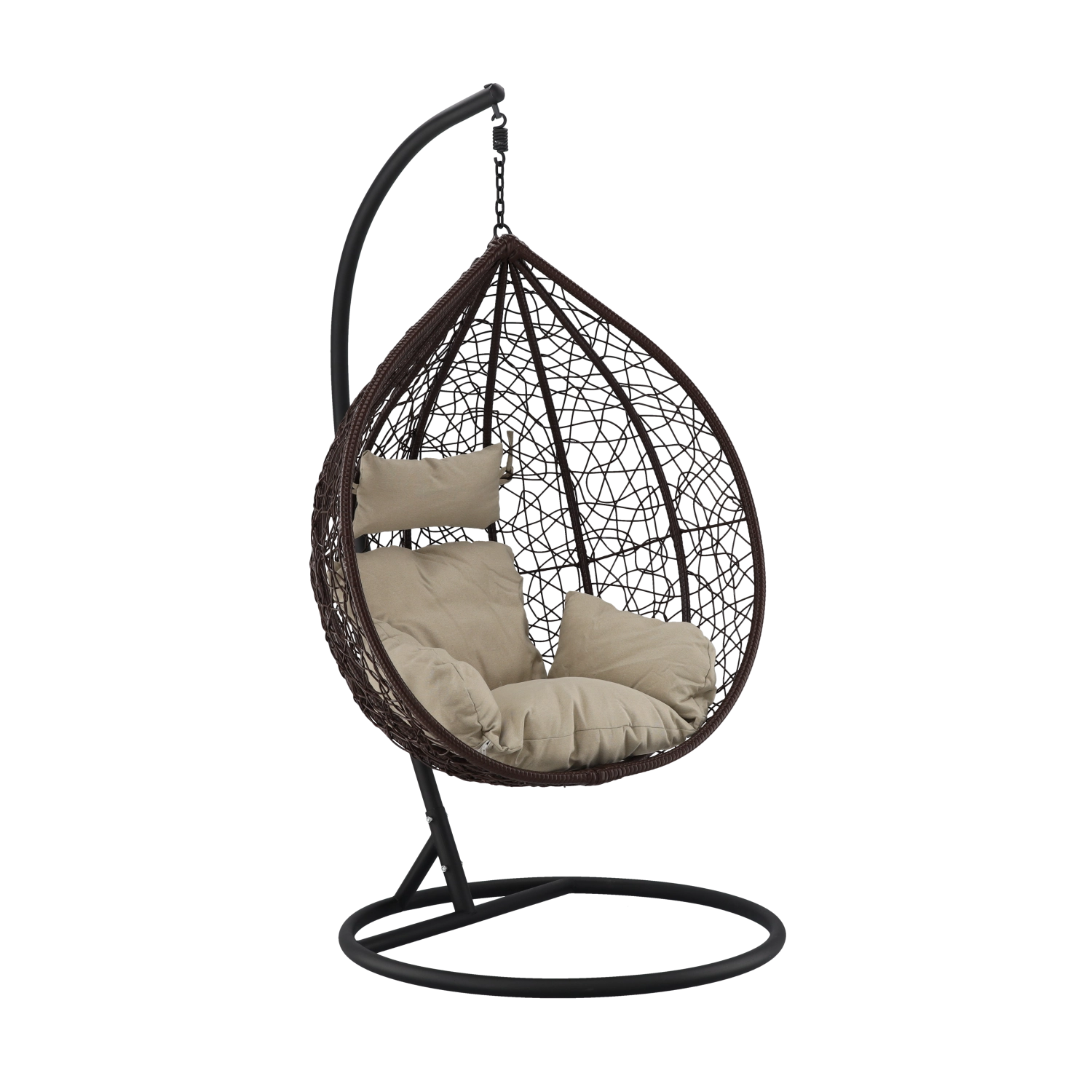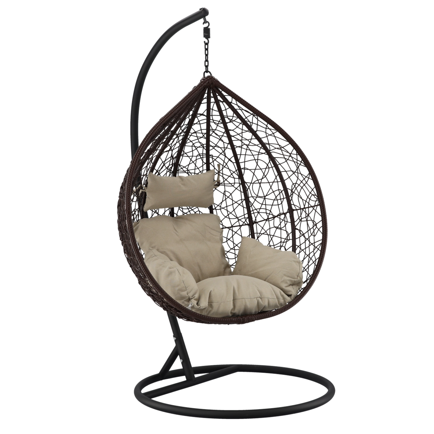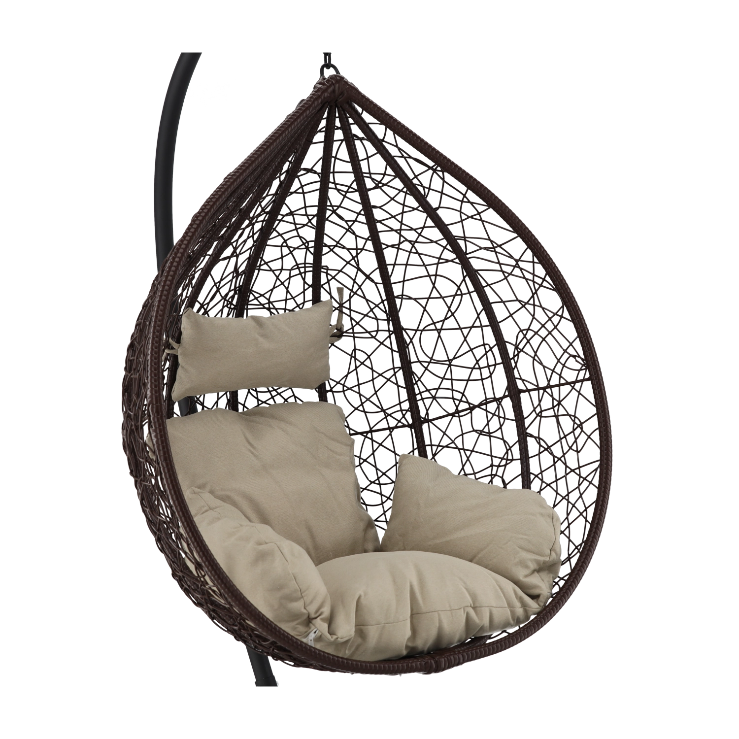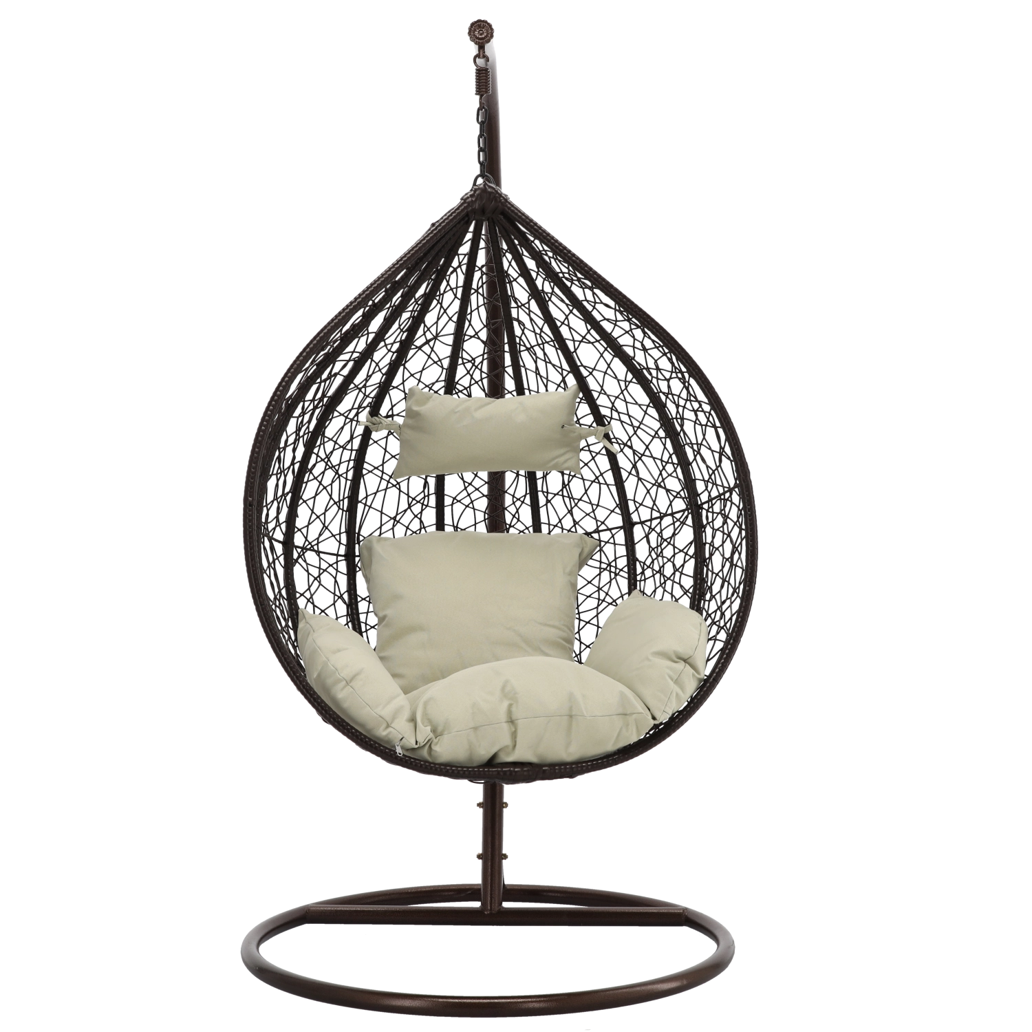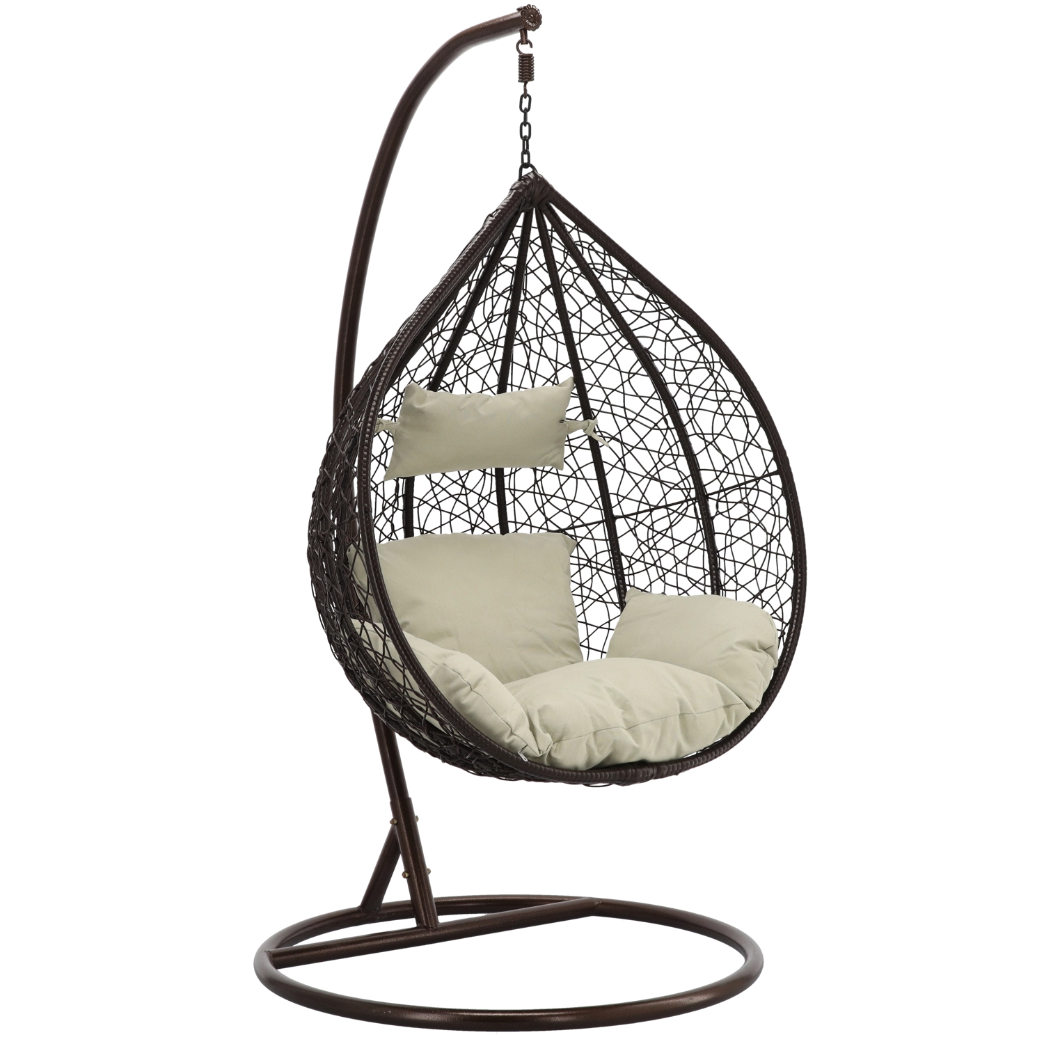 Užijte si dokonalý odpočinek v elegantním závěsném vajíčkovém křesle s hnědým rámem a pohodlnými béžovými polštáři. Odolný technoratan, stabilní ocelová konstrukce a nosnost 150 kg z něj dělají ideální volbu na terasu, zahradu i do interiéru.