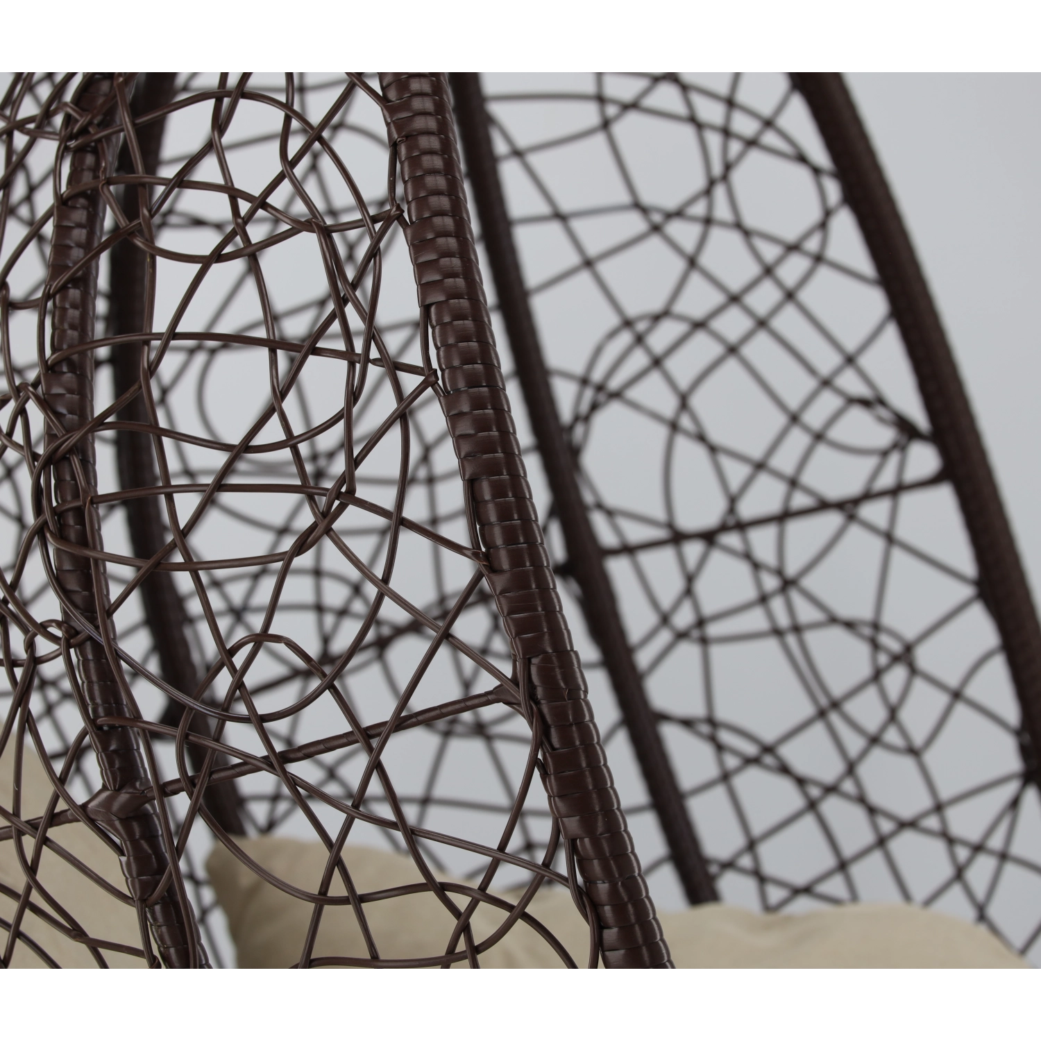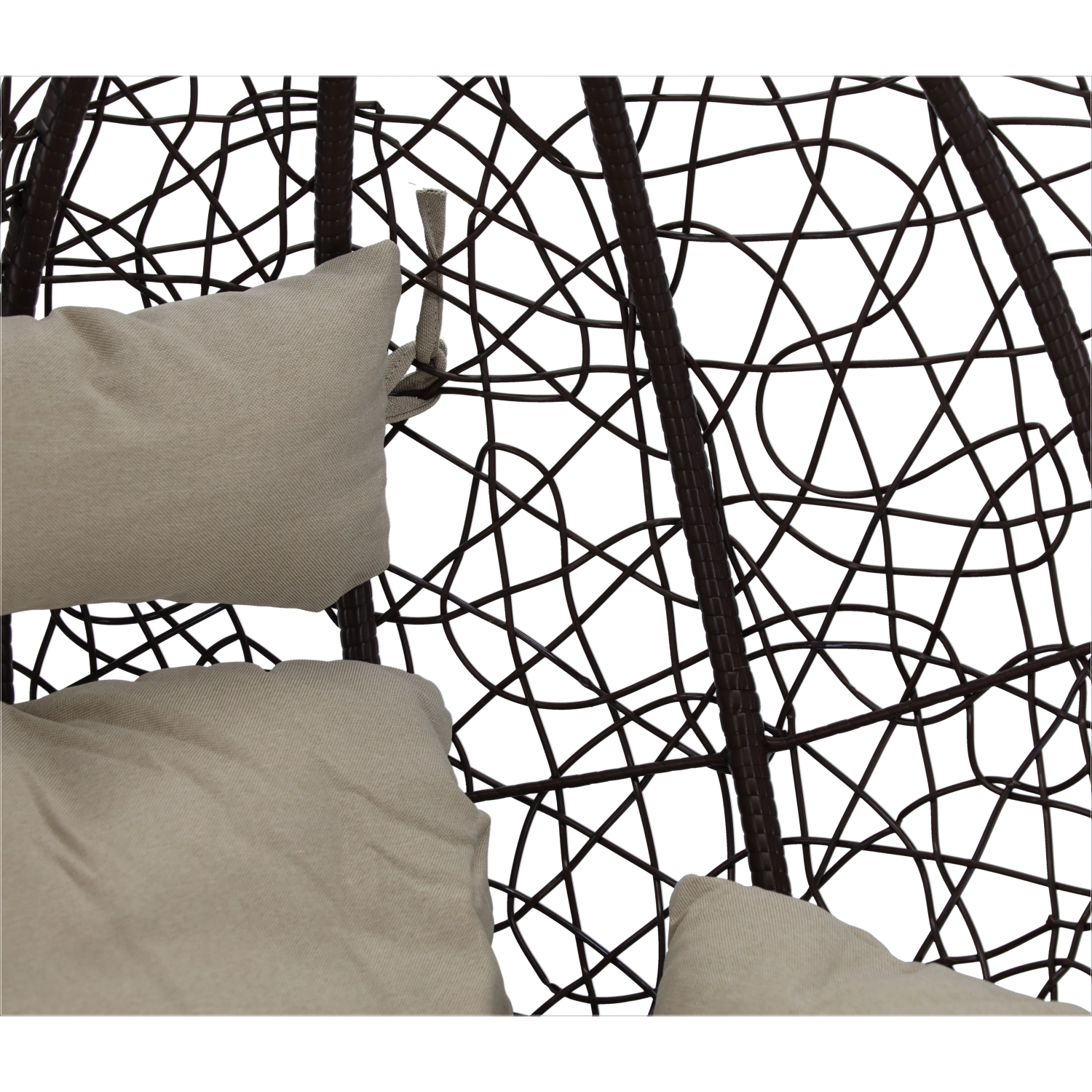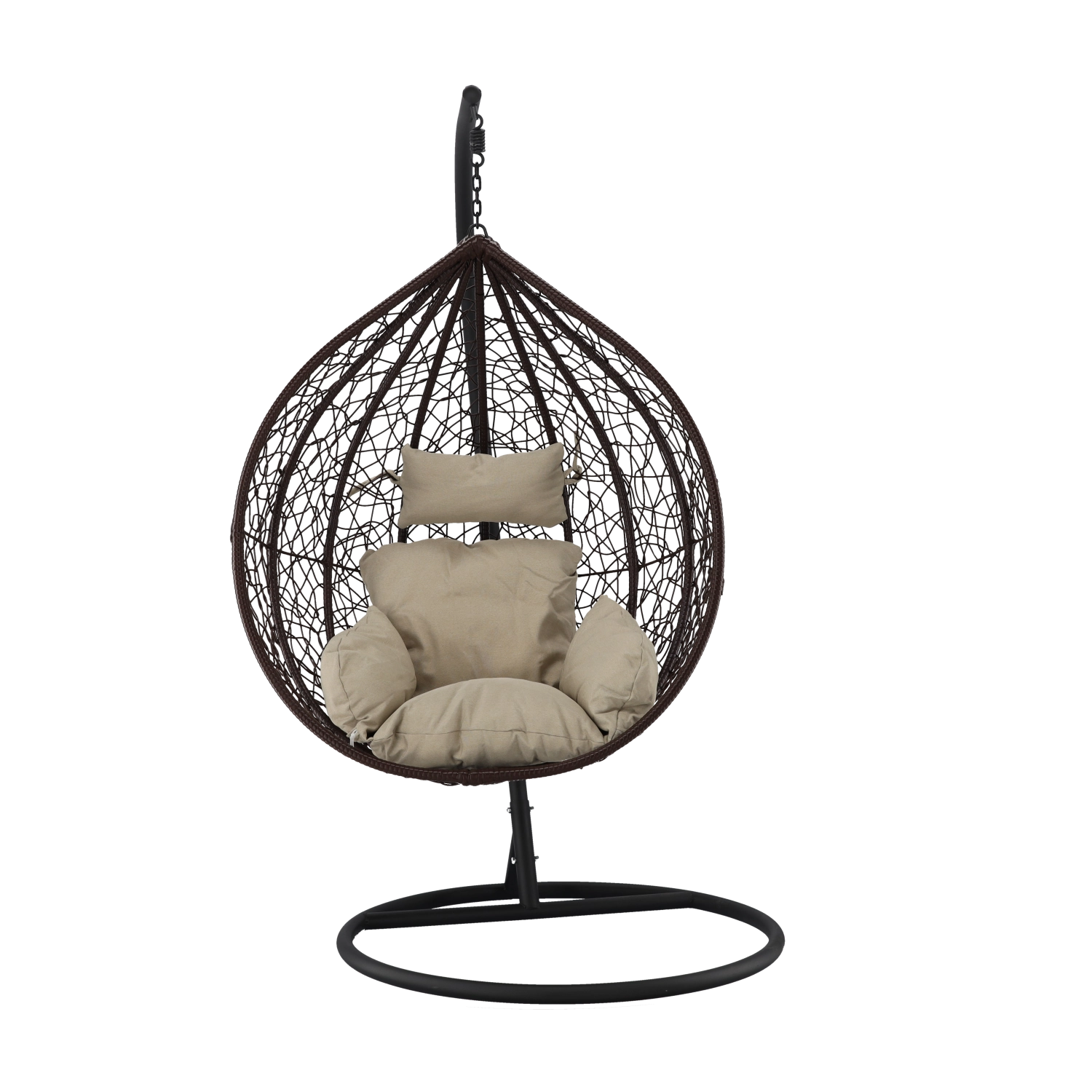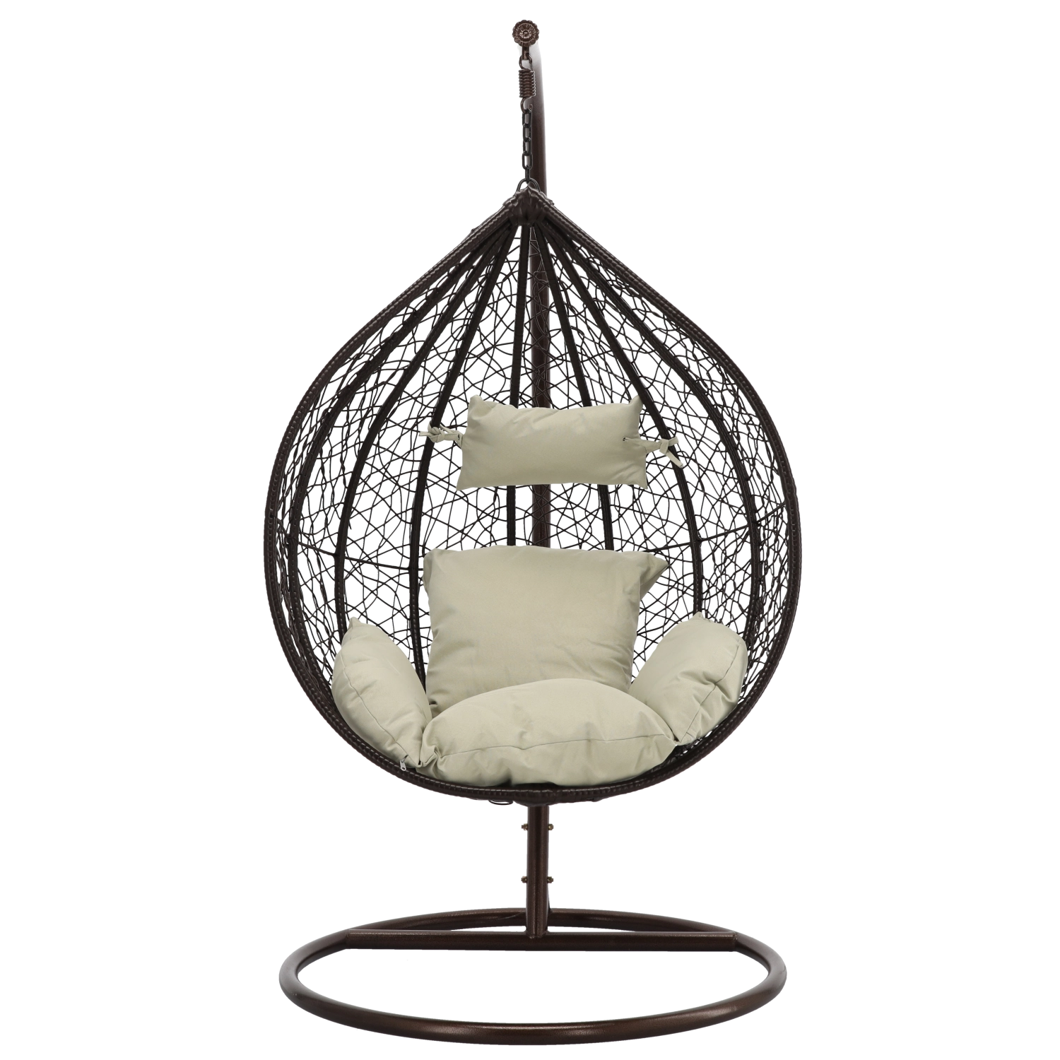 Užijte si dokonalý odpočinek v elegantním závěsném vajíčkovém křesle s hnědým rámem a pohodlnými béžovými polštáři. Odolný technoratan, stabilní ocelová konstrukce a nosnost 150 kg z něj dělají ideální volbu na terasu, zahradu i do interiéru.
