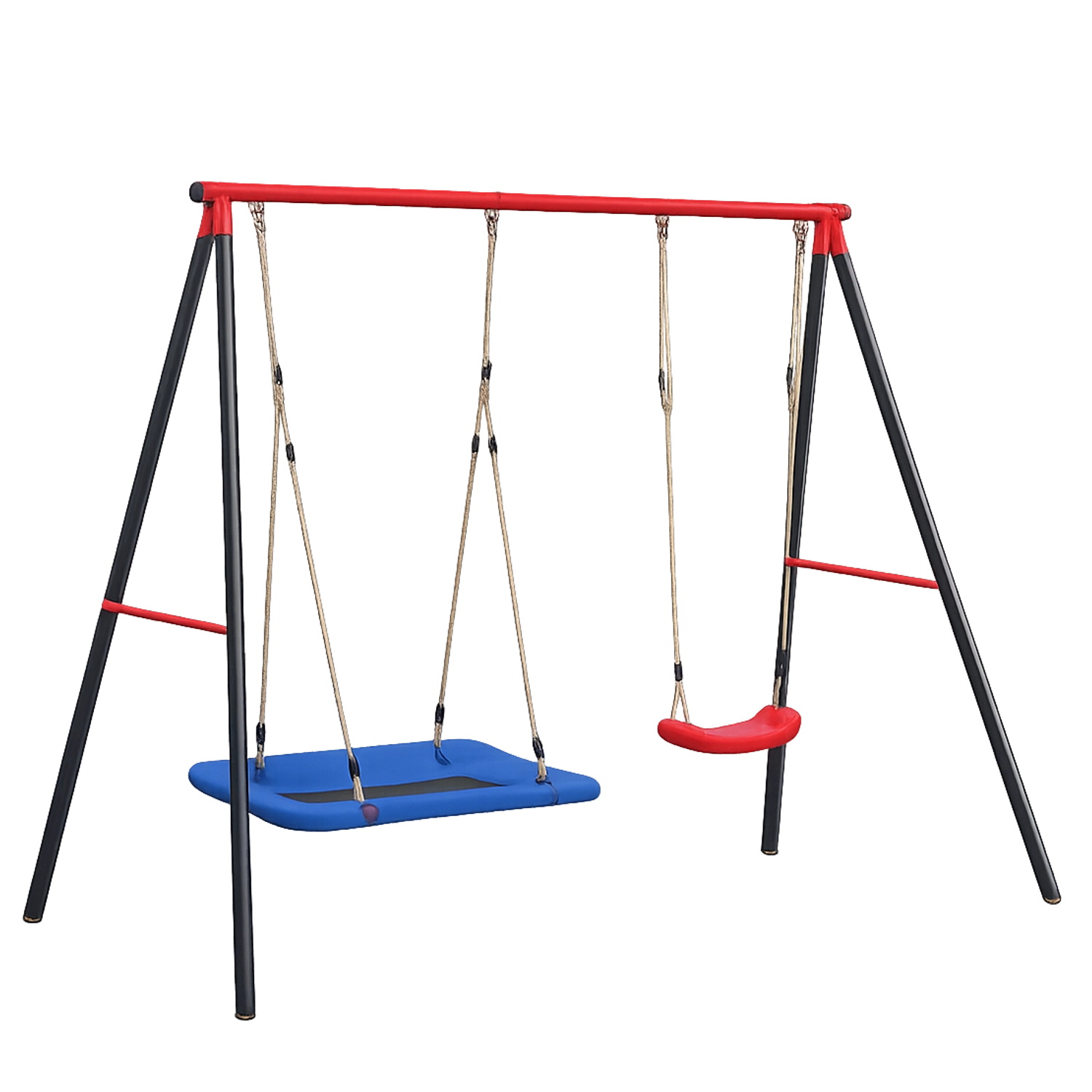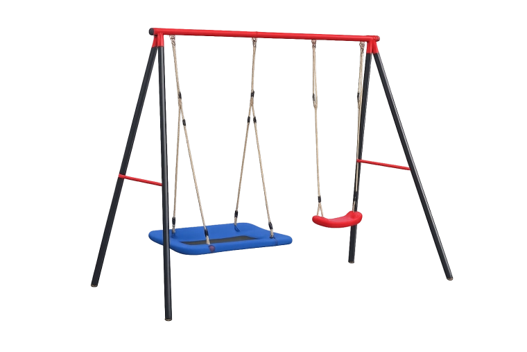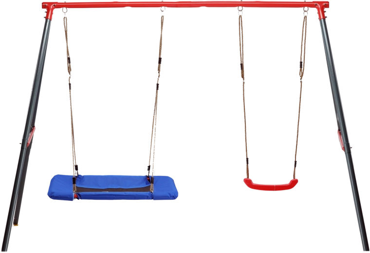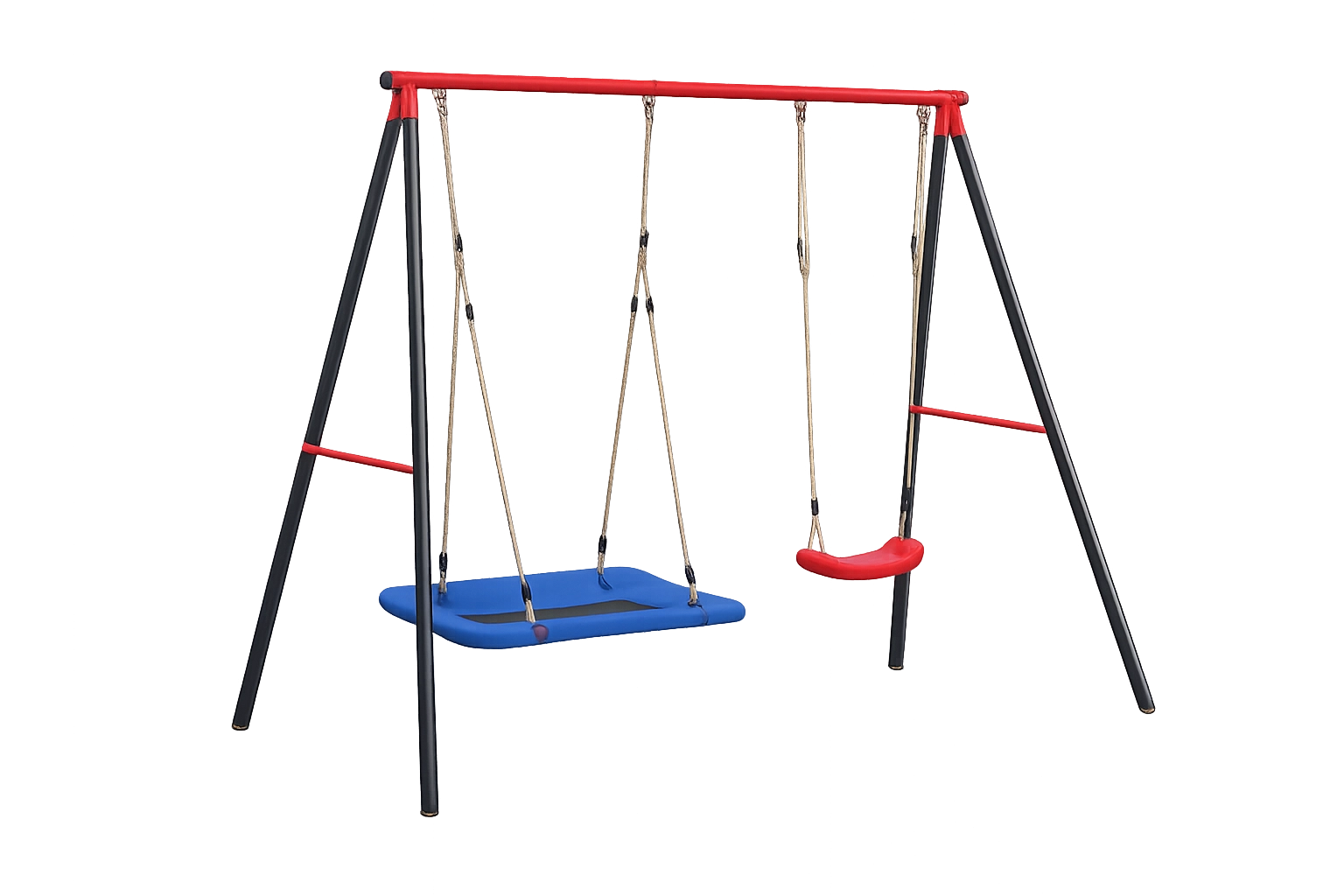 Praktická a zábavná sada pro venkovní hraní spojuje klasickou houpačku s moderním hnízdovým sedákem. Robustní A-konstrukce s červeným horním nosníkem a ocelovými nohami zajišťuje výbornou stabilitu, zatímco odolné provazové či řetězové zavěšení garantuje plynulé a bezpečné houpání. Díky atraktivním barvám, které neblednou, se stane ozdobou každé zahrady.