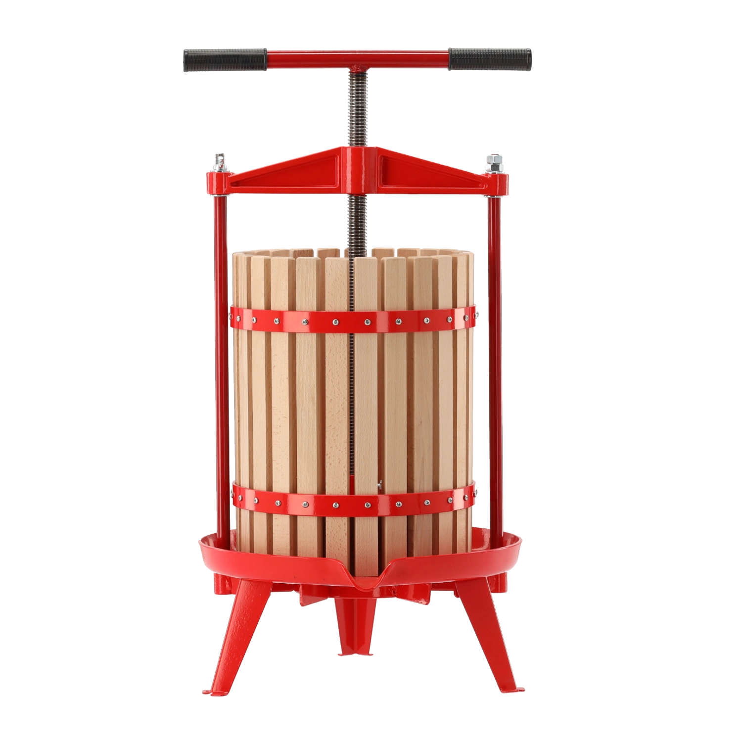 Šroubový mechanismus s T‑rukojetí zajišťuje rovnoměrný tlak a bezpečné ovládání. Konstrukce je navržena pro dlouhou životnost a snadnou údržbu, což z tohoto lisu dělá praktického pomocníka pro každého, kdo miluje domácí mošty a cider.