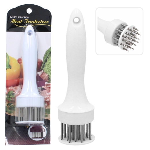 Praktický nabodávač na maso z nerezové oceli s plastovou rukojetí pro pohodlné používání. Díky ostrým jehlám lépe pronikne marináda, maso bude po tepelné úpravě šťavnaté, aromatické a rovnoměrně propečené. Lehká konstrukce zajišťuje snadnou manipulaci v kuchyni i při grilování.
