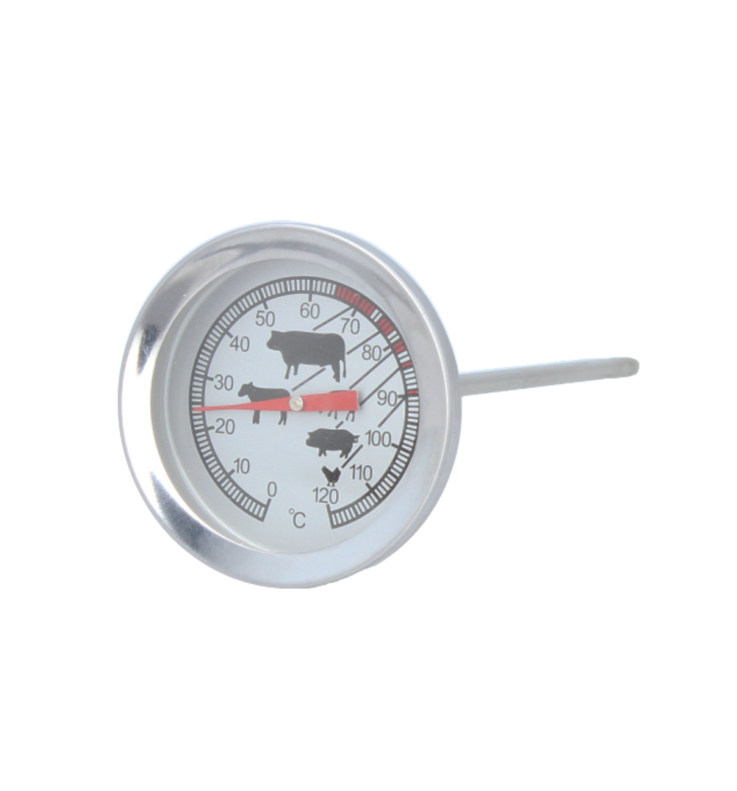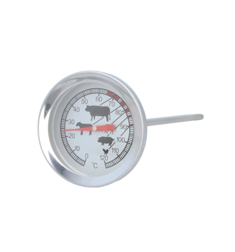 Dosáhněte konzistentně skvělých výsledků při pečení a grilování. Tento teploměr na maso z vysoce kvalitní nerezové oceli nabízí rychlé a přesné odečty teploty v rozmezí 0–120 °C. Stačí jej zapíchnout do nejtlustší části masa, vyhnout se kostem a průběžně kontrolovat teplotu. Díky přehlednému ciferníku s ikonami pro různé druhy masa snadno poznáte, kdy je pokrm hotový.