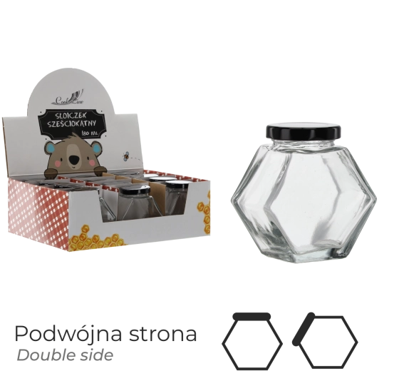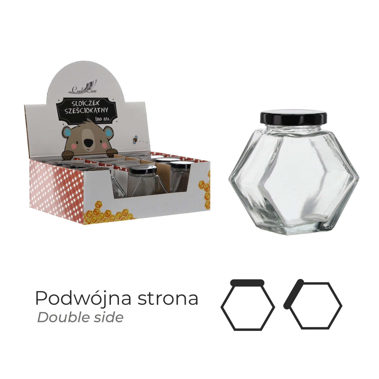 Praktická šestihranná sklenice o objemu 180 ml se šroubovacím víčkem pro bezpečné uzavření. Ideální pro med, džemy, koření a další drobné potraviny. Dodává se v balení po 12 kusech pro přehlednou prezentaci i pohodlný prodej.