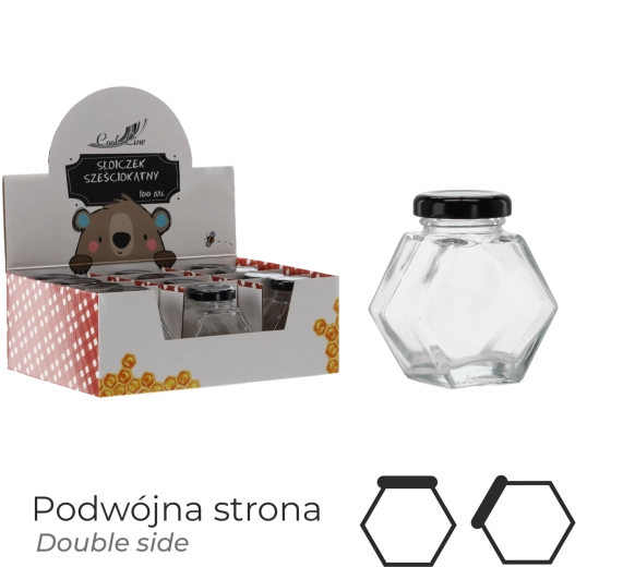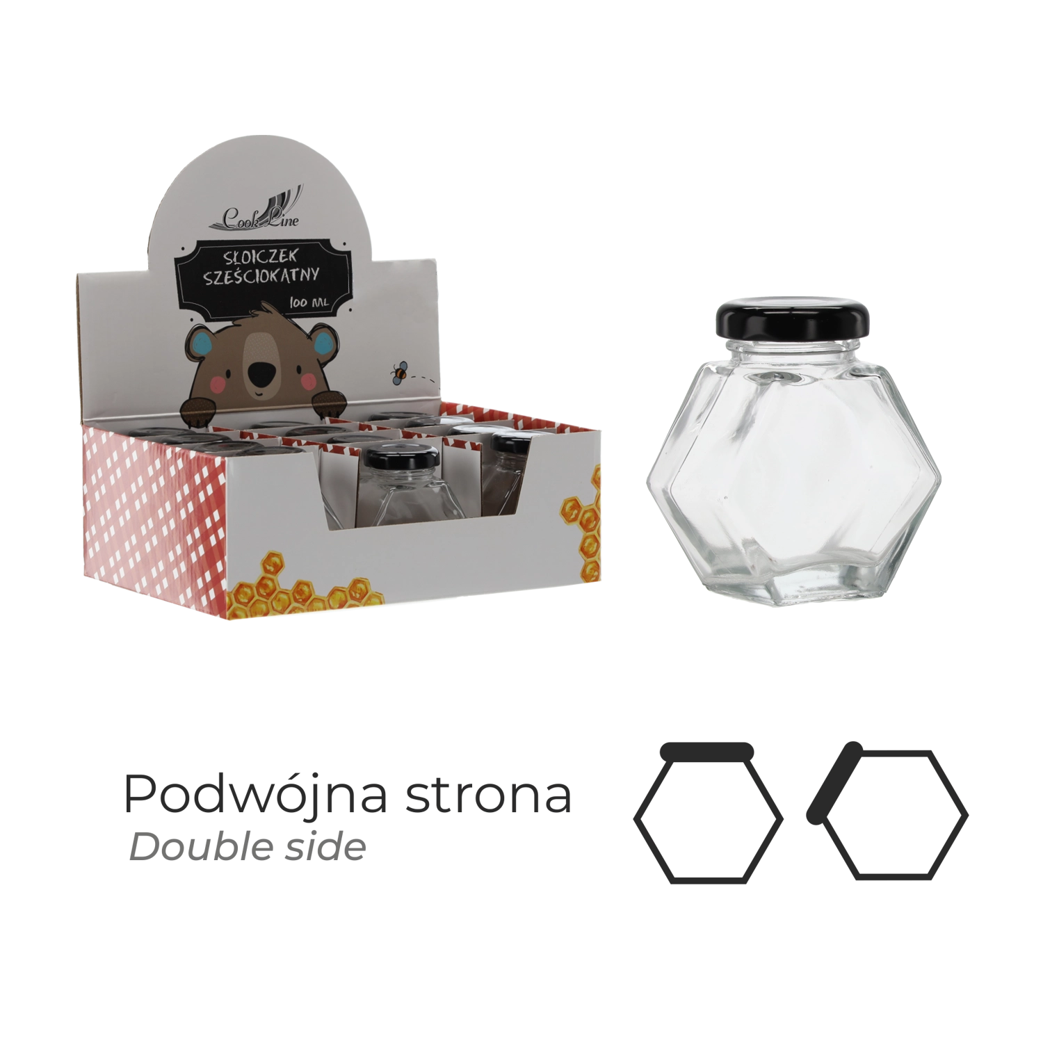 Elegantní šestihranná sklenice s objemem 100 ml je skvělou volbou pro uchovávání medu, marmelád, koření, bylinek či drobných delikates. Díky těsnému víčku zůstává obsah déle čerstvý a bezpečně uzavřený. Kompaktní velikost se hodí do kuchyně, na dárkové sety i na domácí výrobu.