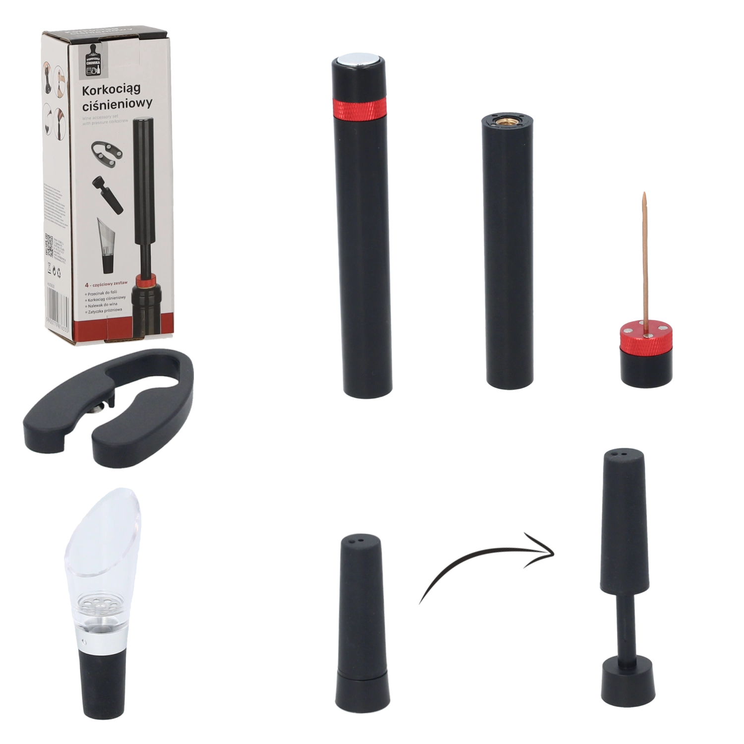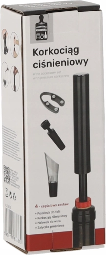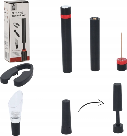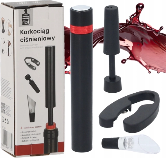 Elegantní dárková sada pro milovníky vína obsahuje vše potřebné pro pohodlné otevření a servírování: tlakový vývrtka, řezač fólie, uzávěr lahve a nalévací nástavec s aerátorem. Kombinace nerezové oceli a odolného plastu v černém provedení zaručuje dlouhou životnost a moderní vzhled.