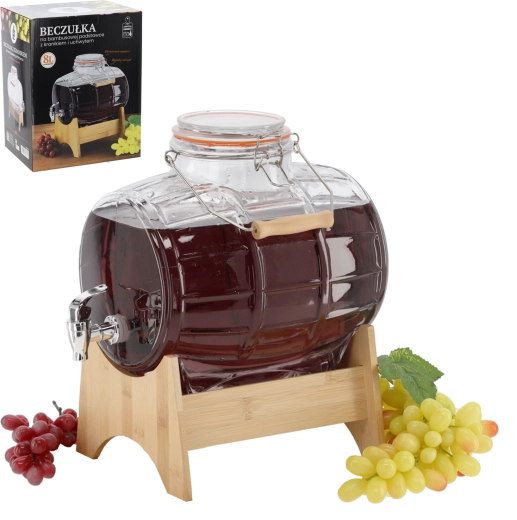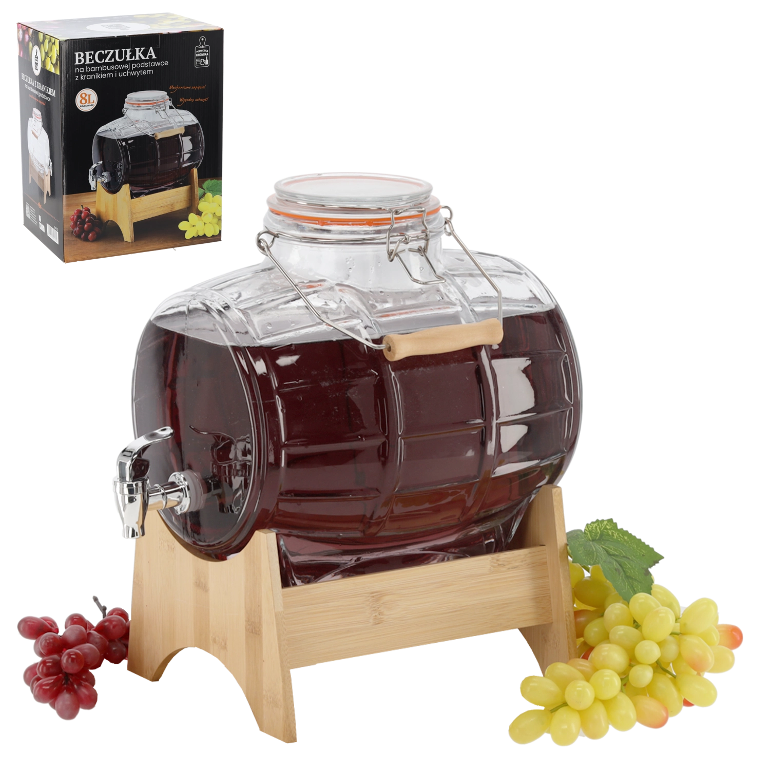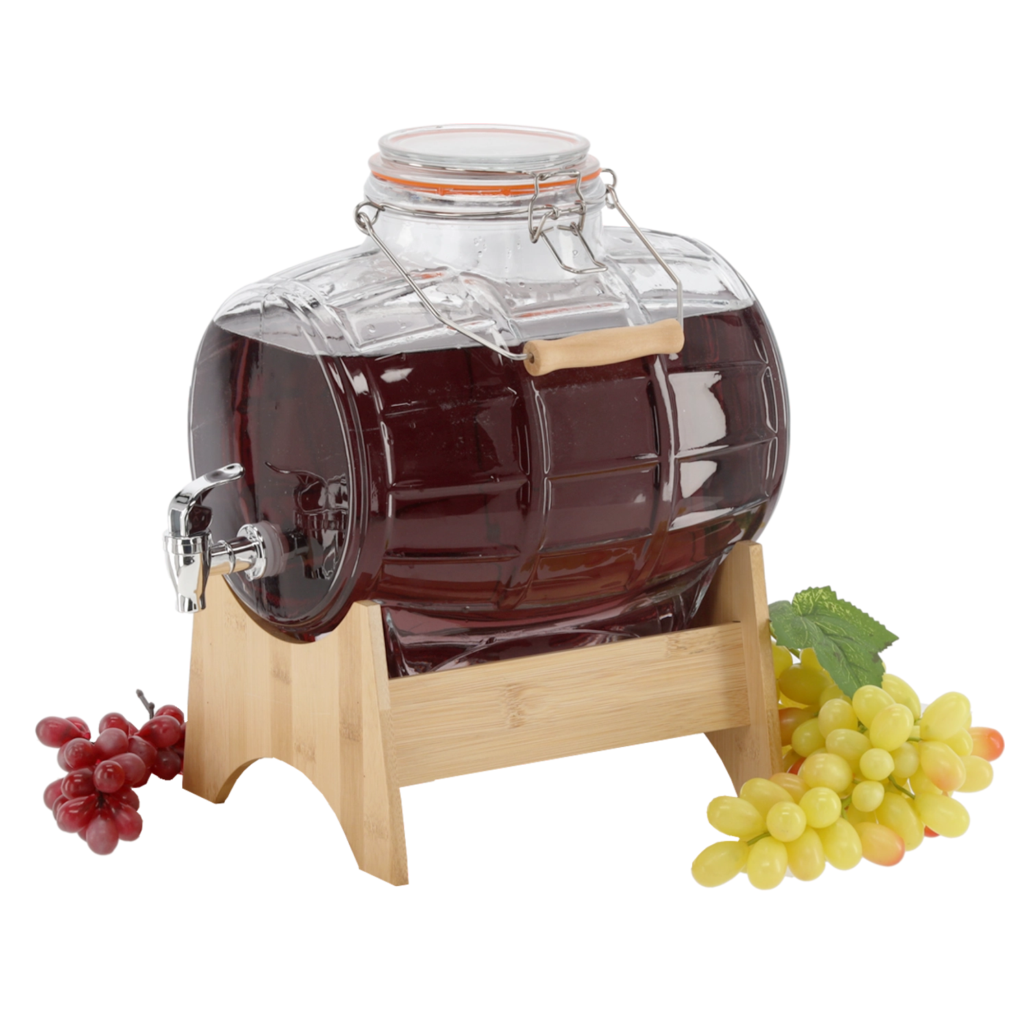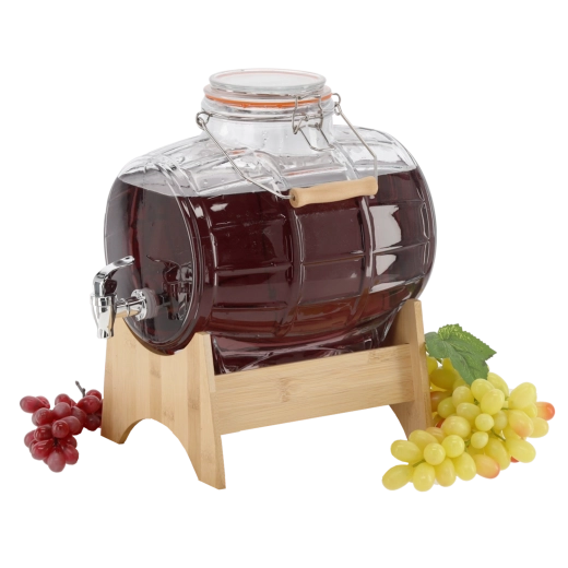 Elegantní skleněný sud o objemu 8 l s bambusovým podstavcem, praktickým kohoutkem a mechanickým uzávěrem je ideální pro servírování domácích likérů, whisky, džusů a limonád na oslavách i svatbách. Stabilní bambusový podstavec usnadňuje nalévání i do vyšších sklenic, gumové těsnění chrání aroma a čerstvost a integrované držadlo zajišťuje pohodlné přenášení.