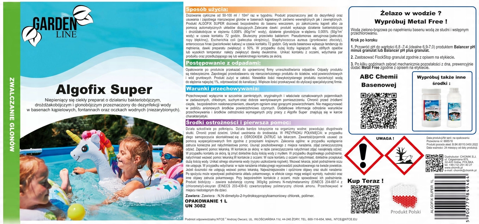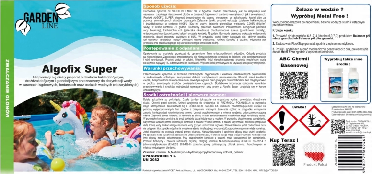Algofix Super je moderní, nepěnivý kapalný přípravek pro komplexní dezinfekci bazénové vody. Účinně ničí řasy, bakterie a kvasinky, udržuje vodu křišťálově čistou a bezpečnou v venkovních i vnitřních bazénech, fontánách a nezarybněných zahradních jezírkách. Ideální i při vysokých teplotách a intenzivním používání bez tvorby pěny.