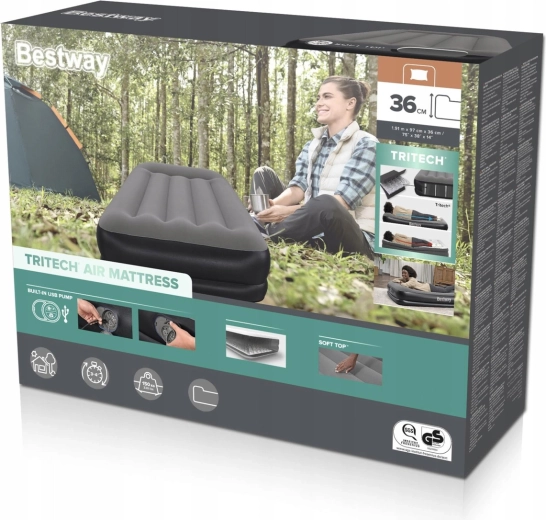 Nafukovací postel BESTWAY TRITECH kombinuje stabilitu a komfort. Třívrstvé jádro Tritech s polyesterovou mřížkou posílenou PVC zajistí dlouhodobou tvarovou stálost, nižší únik vzduchu přes noc a příjemně pevnou oporu těla. Zvýšený profil 36 cm usnadňuje vstávání a zároveň lépe izoluje od chladu podlahy.