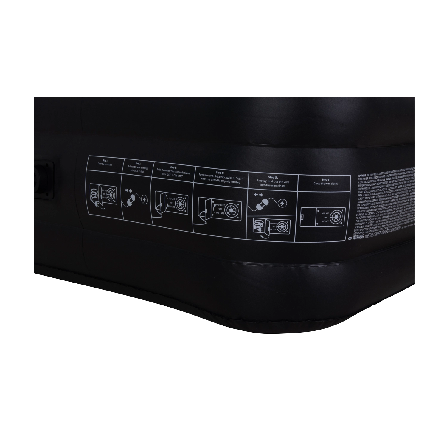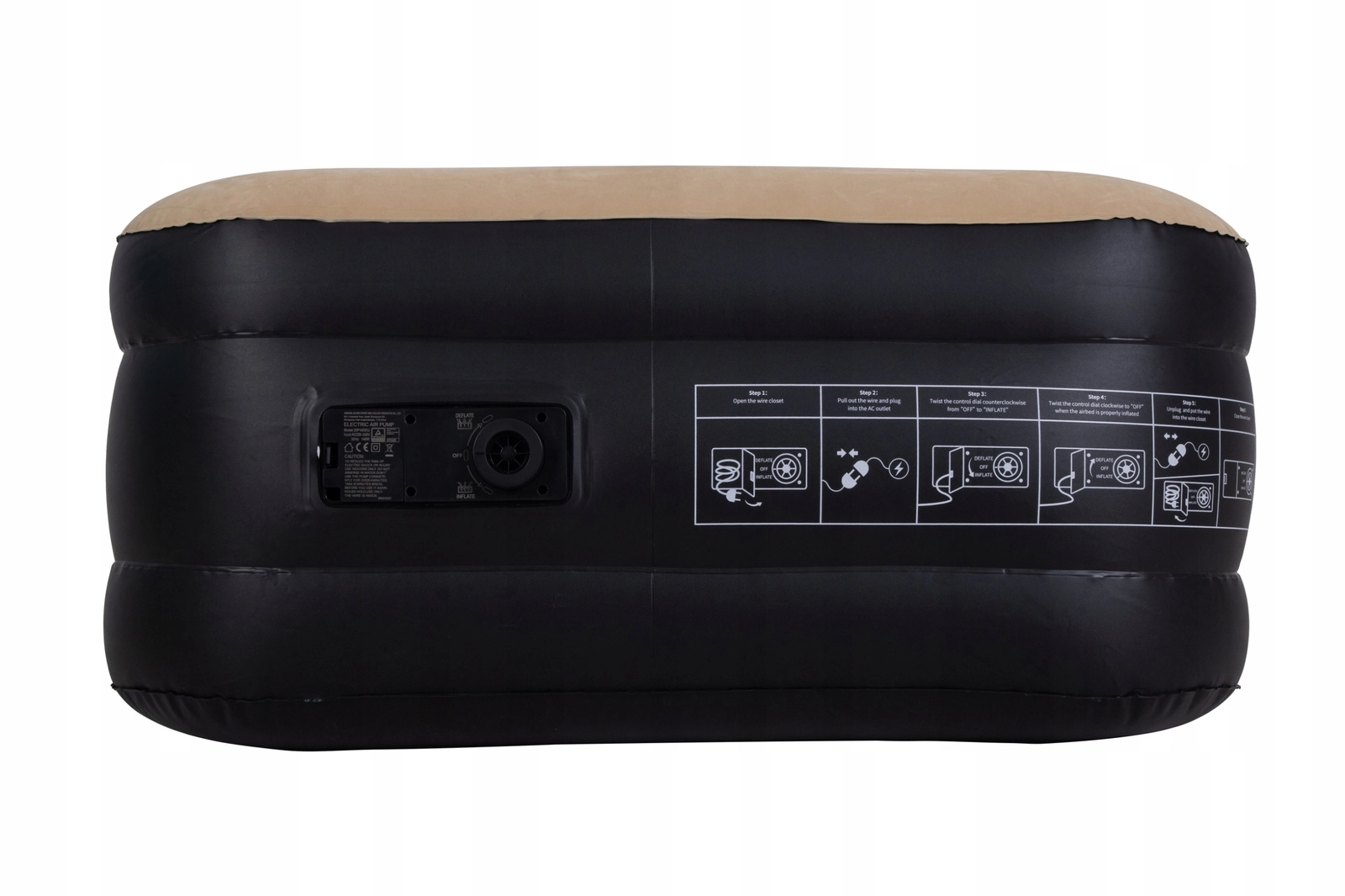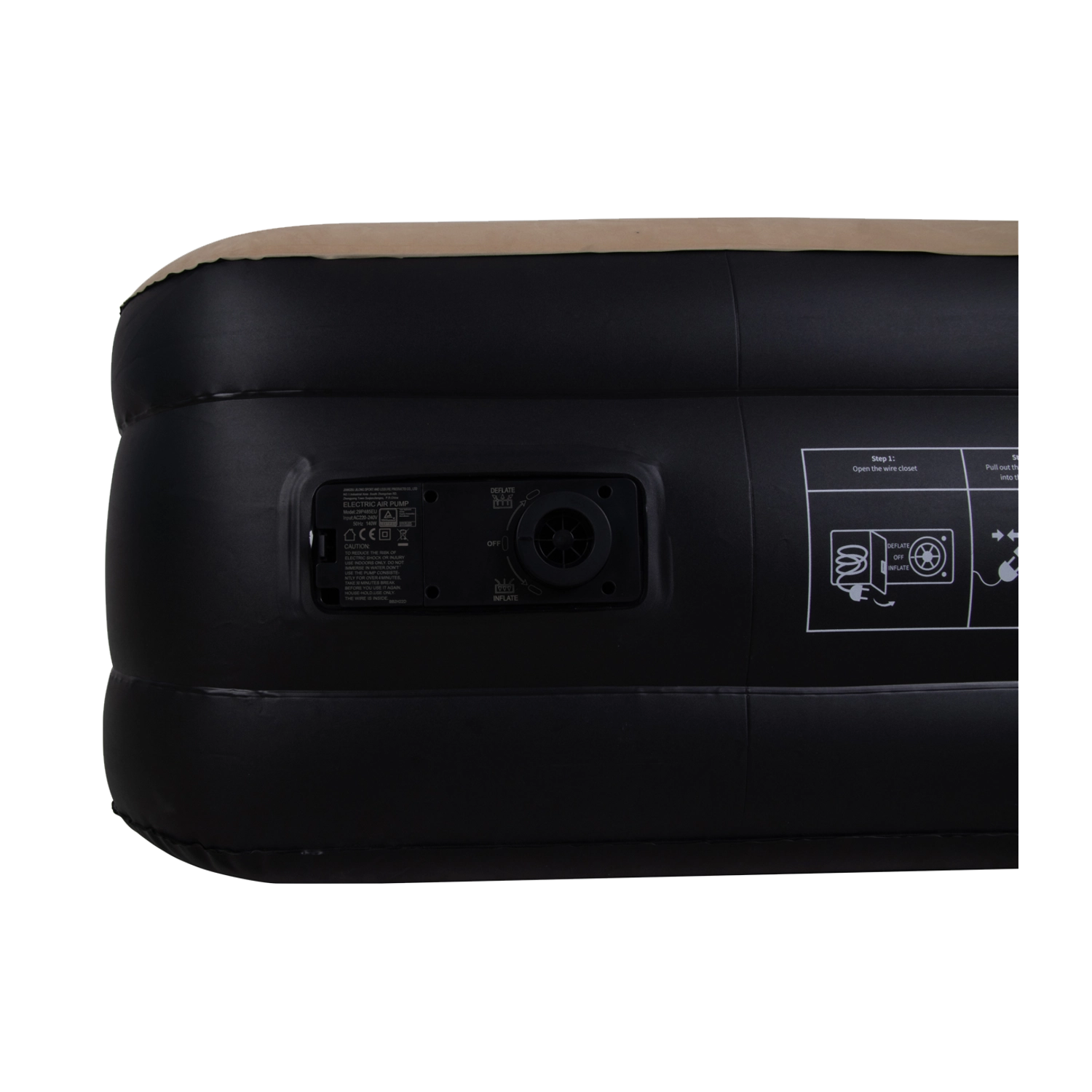 Vestavěná pumpa nafoukne i vyfoukne postel za cca 2 minuty. Jednoduché ovládání přímo na boku matrace šetří čas i místo.